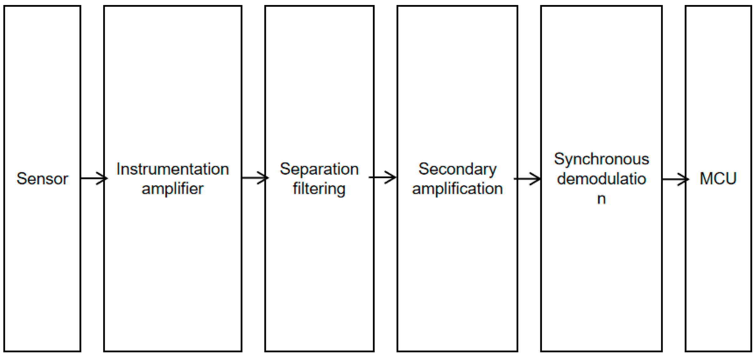 Addressing the fact that the measurement electrode output signal is weak (only a few mV), contains substantial noise and has high source impedance and that interference coupled from the power supply (power frequency) and generated by the alternating magnetic field can have amplitudes far greater than the flow signal, a four-stage processing circuit is designed: “Pre-filtering—Separation Filtering—Secondary Amplification—Synchronous Demodulation & Fusion” [
