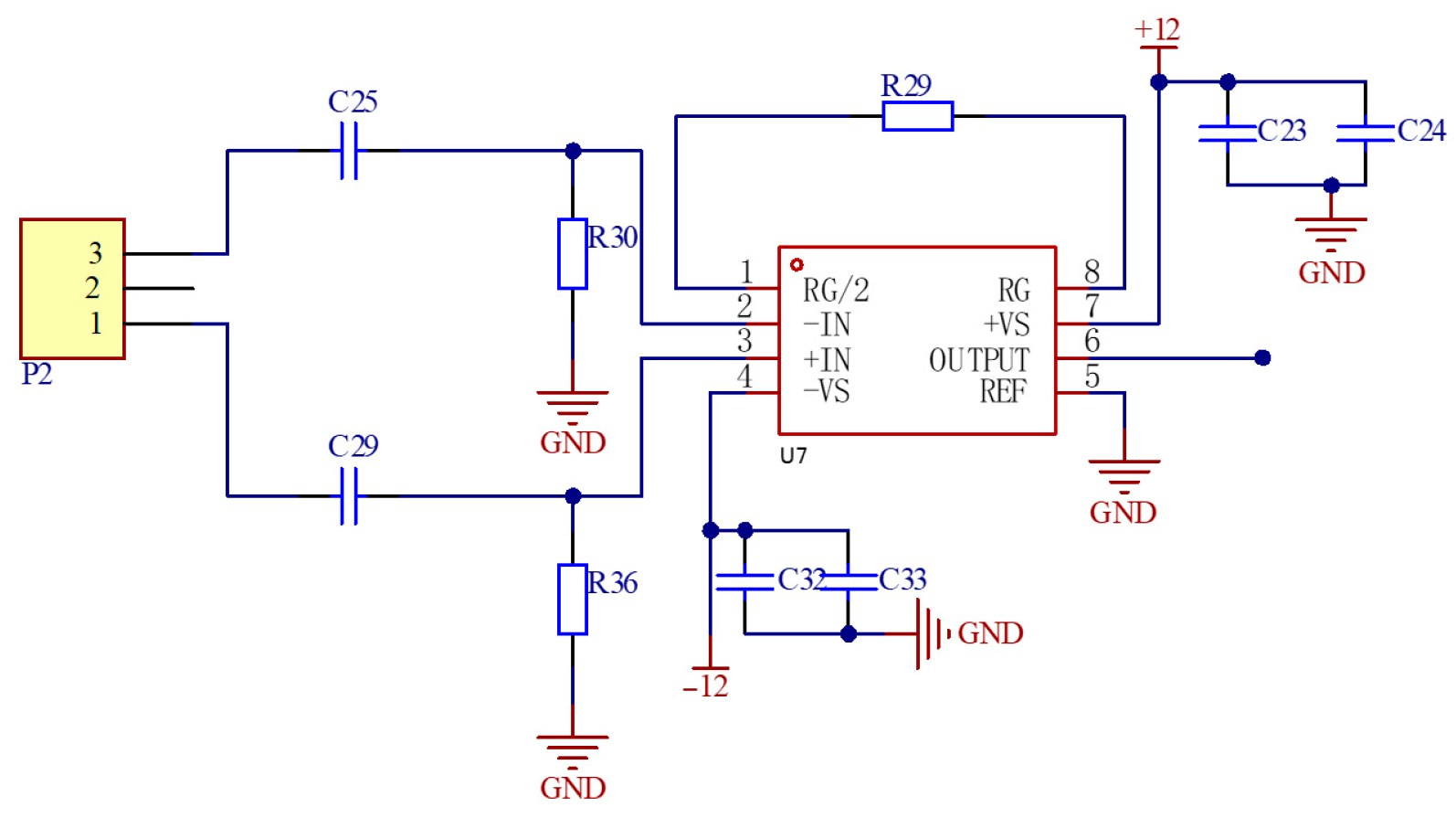 Due to the high signal source impedance, the signal processing module first employs a high-input-impedance, high-Common-Mode Rejection Ratio (CMRR > 100 dB) instrumentation amplifier for differential amplification. To avoid saturation and excessive amplification of noise initially, a relatively low gain is set (typically around 10 times, adjustable via R29). The amplification circuit is shown in