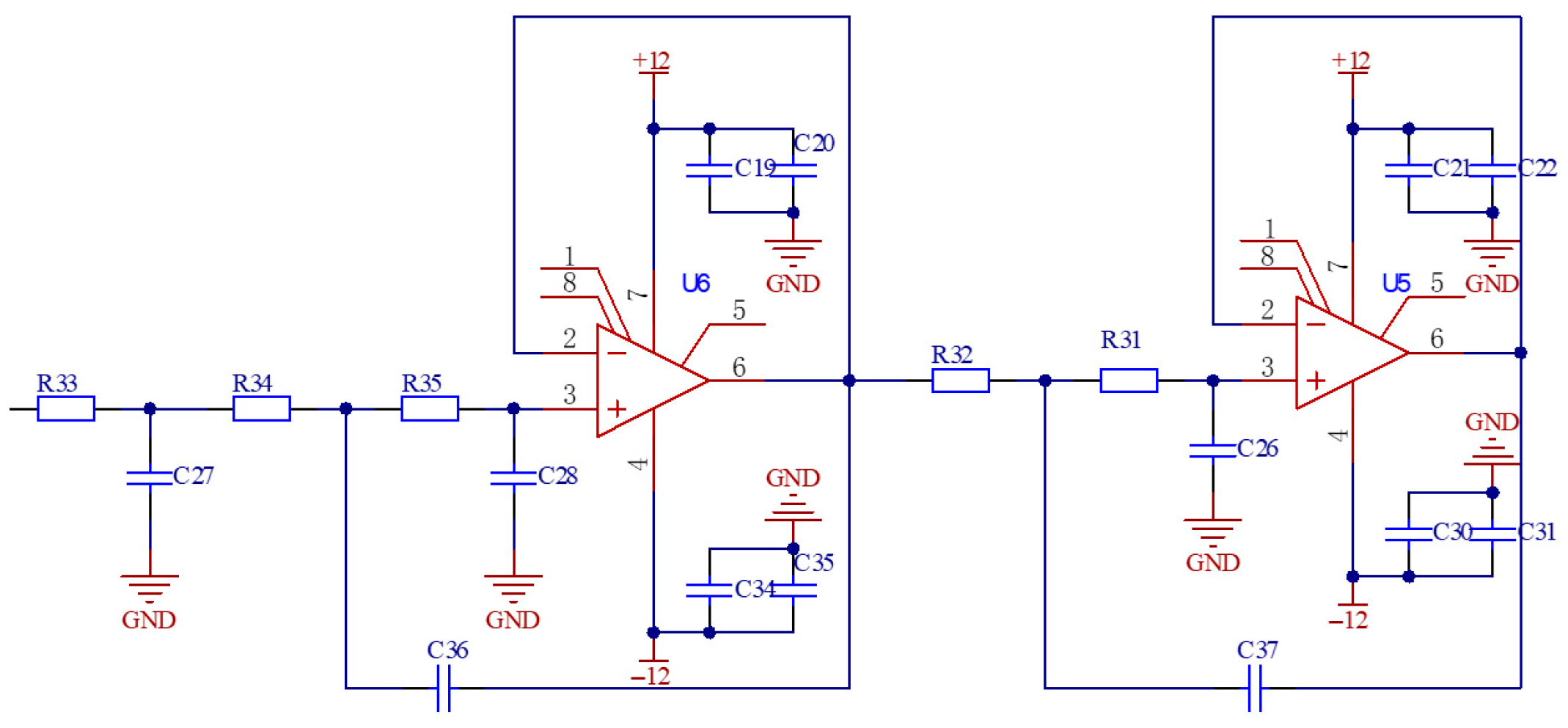 To effectively separate the low-frequency and high-frequency signals and strongly suppress the 50 Hz power frequency interference, a high-order separation filter bank is designed. The Butterworth filter features the flattest possible passband response, making it suitable for designing this high anti-interference signal processing circuit. Based on the Butterworth filter’s amplitude-frequency response characteristics, a fifth-order Butterworth low-pass filter circuit is designed to suppress interference signals [