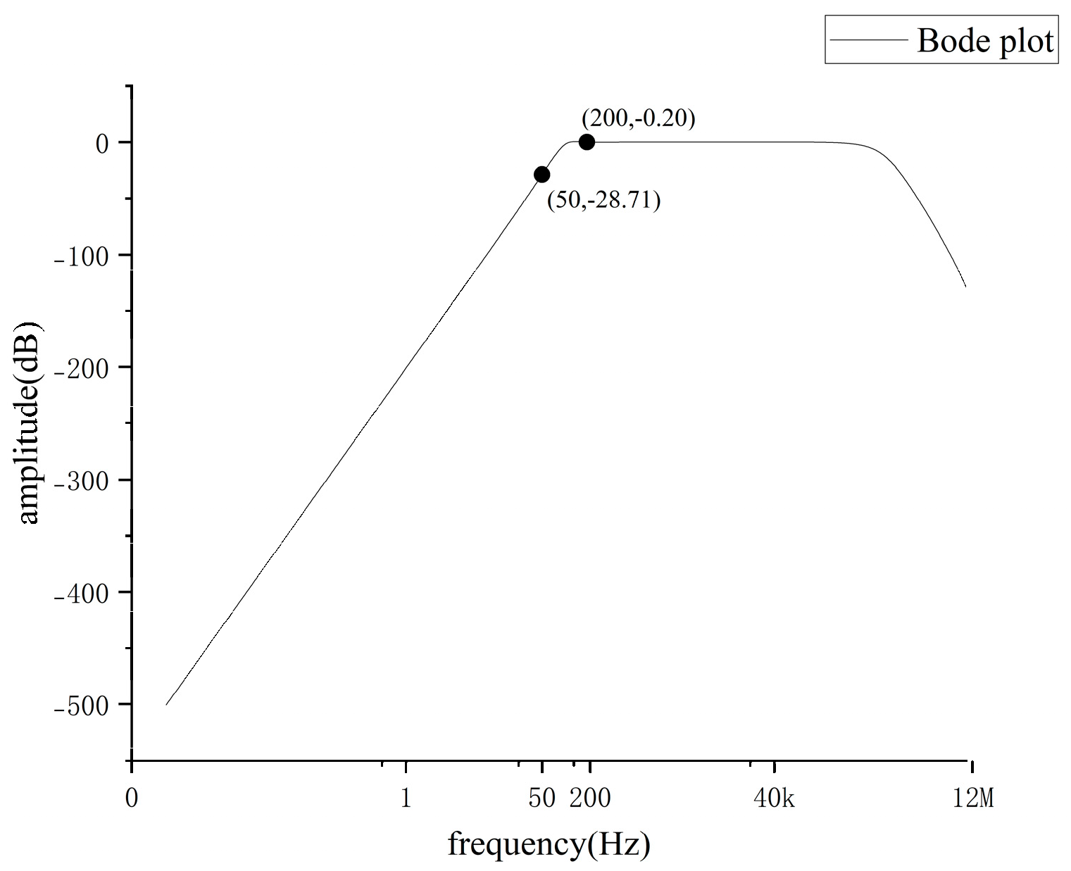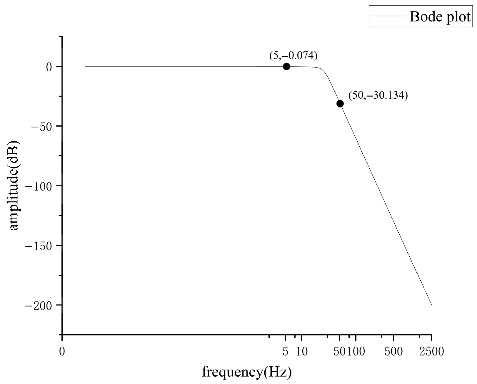 A comparison of the Bode plots shows that the 5 Hz signal experiences almost no attenuation, while the 50 Hz power frequency interference signal is attenuated by approximately −30 dB, achieving deep suppression of power frequency interference.