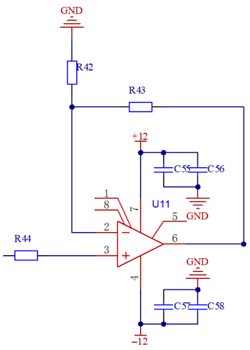 The gain of this stage is adjusted by resistors R43 and R42. Based on the characteristics of the non-inverting operational amplifier, the gain is calculated as . In this stage, the mV-level signal is amplified to the Volt level, meeting the ADC input range (0–3.3 V) and placing the signal near the center of the ADC’s sampling range for higher accuracy.