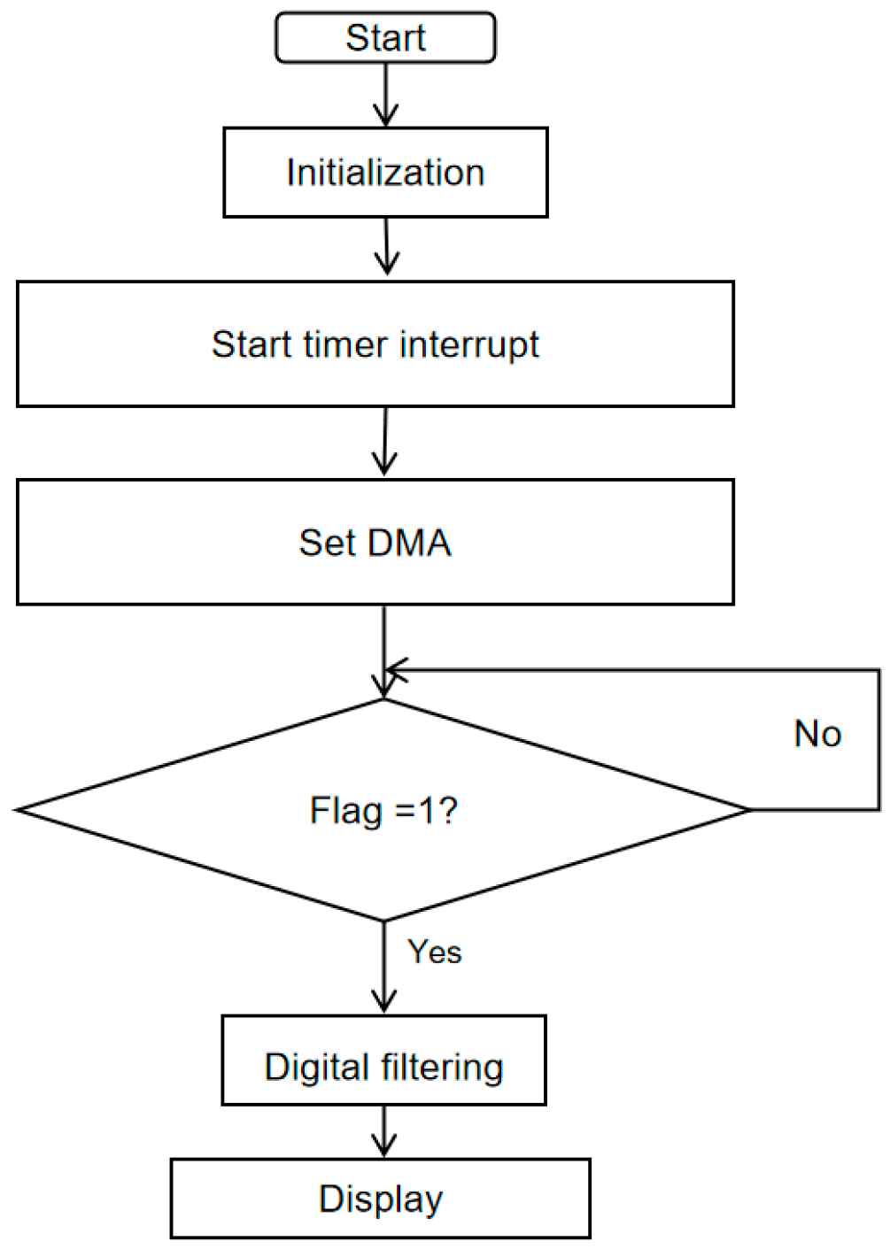 The software design adopts a modular approach, primarily including initialization, ADC data acquisition, digital filtering, and data output modules. The main workflow is shown in