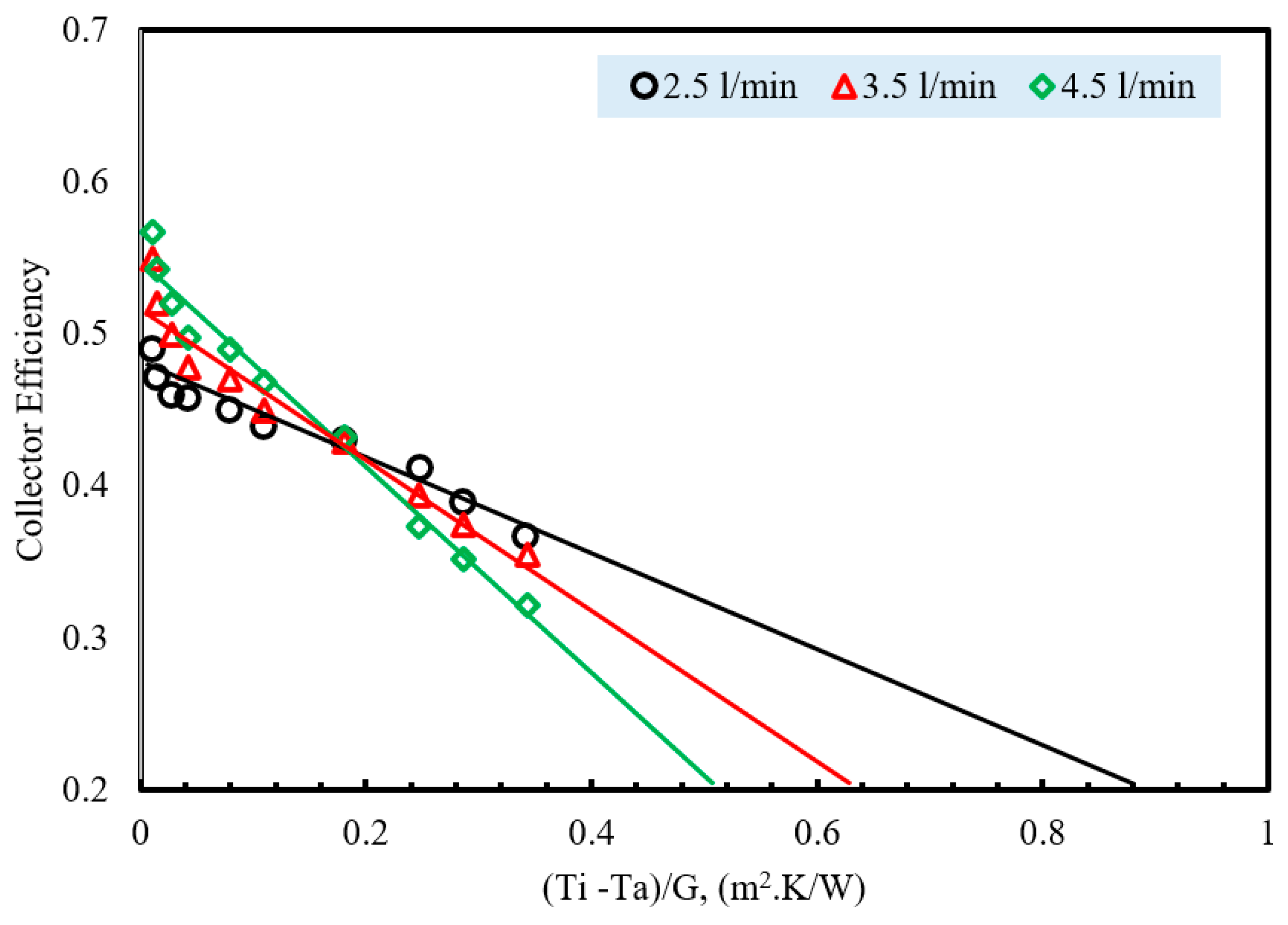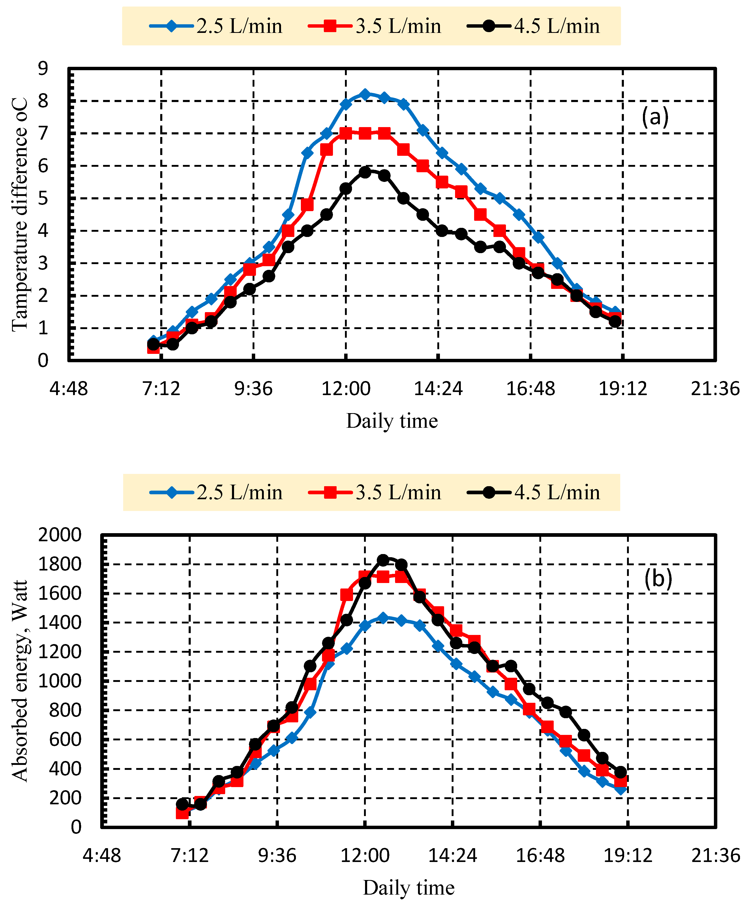 - The lower flow rates consistently yield higher ΔT values because water spends a longer time in the collector, allowing it to absorb more heat. At 2.5 L/min, the system exhibits the highest temperature rise, peaking around 8–8.5 °C. The highest flow rate, 4.5 L/min, produces the lowest ΔT, about 5.5–6 °C at peak conditions. The results highlight the inverse relationship between water flow rate and temperature rise, emphasizing the trade-off between achieving higher outlet temperatures at low flow and maximizing heat extraction at higher flow.