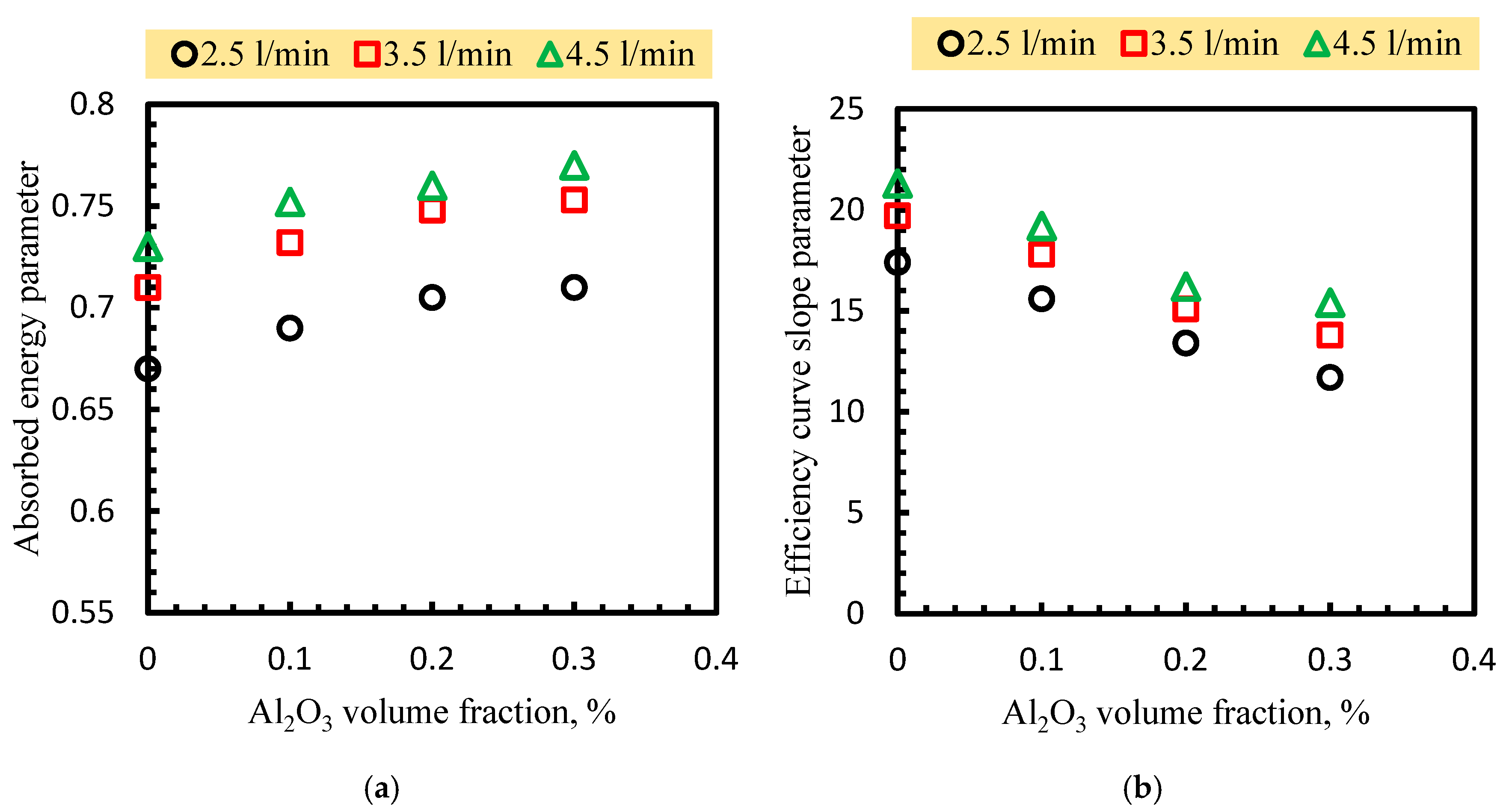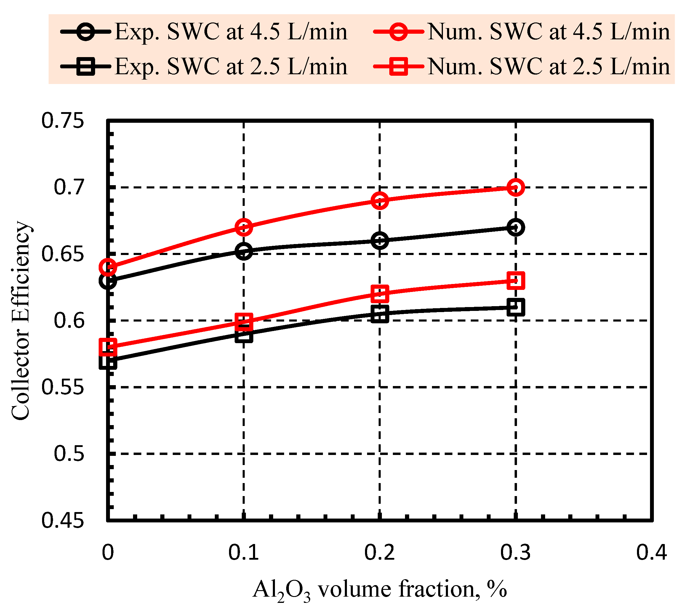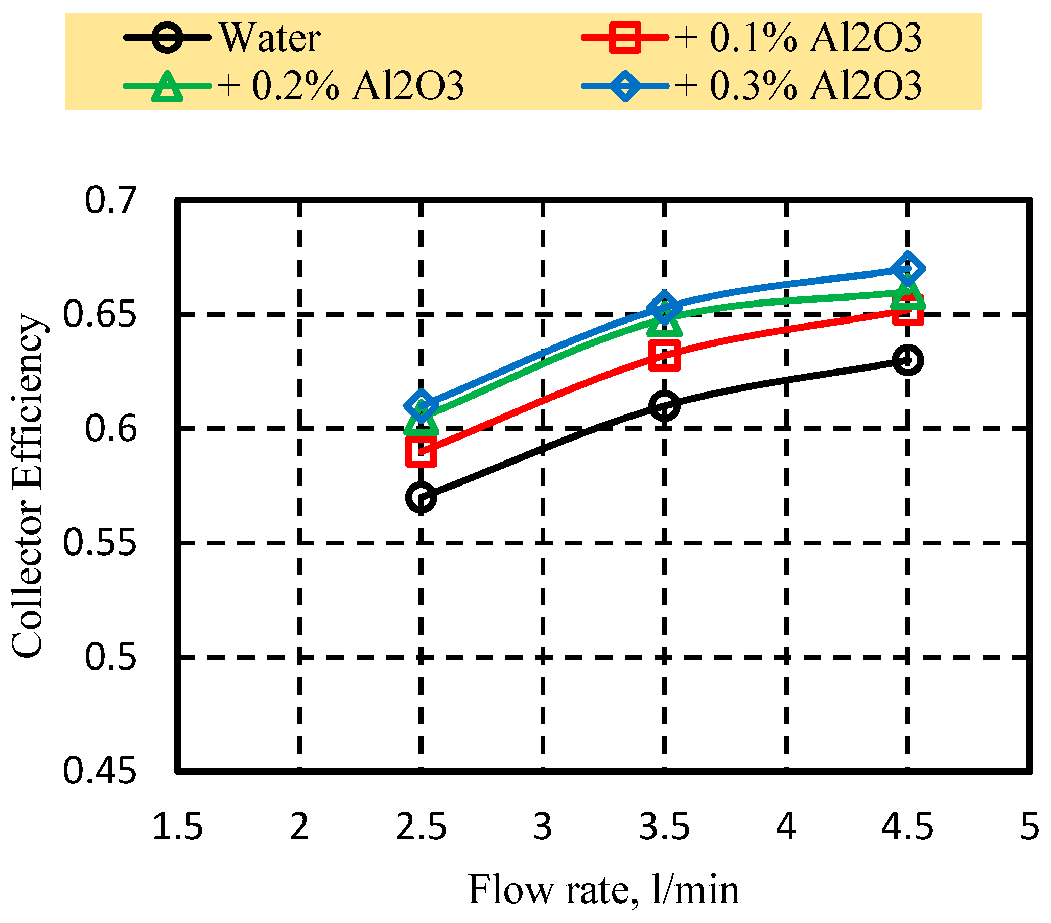 - Results showed that using water only, the collector efficiency increases progressively with flow rate. A significant performance enhancement is observed upon incorporating Al2O3 nanoparticles into the fluid, with 0.1% Al2O3 volume concentration improving efficiency by ~7.4% over water. At 0.3%, the greatest improvement is recorded, yielding a ~9.3% gain in efficiency compared to the base case.