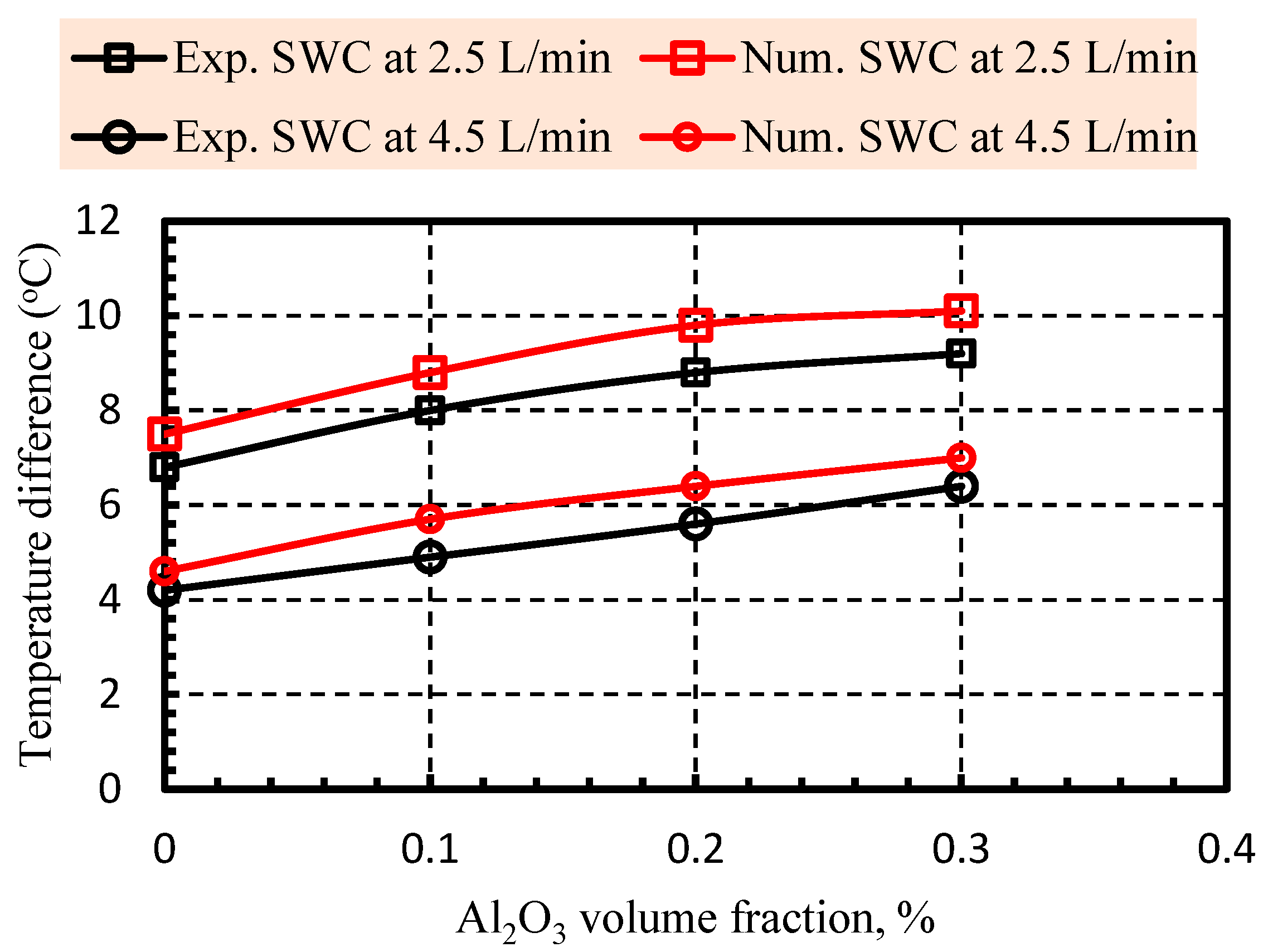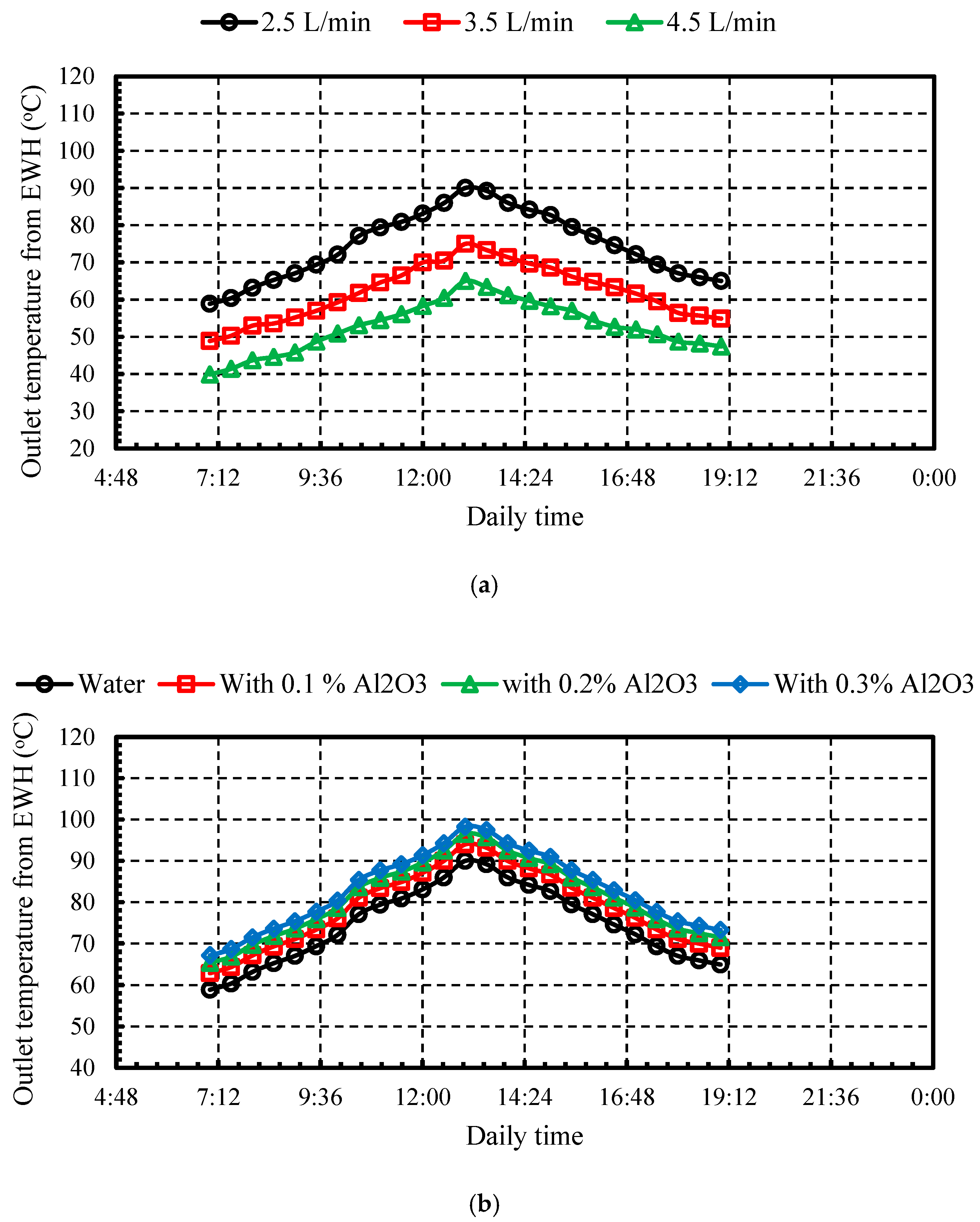- The results indicate that the outlet water temperature from the EWH rises, reaching a maximum of approximately 90.6 °C at the lowest flow rate of 2.5 L/min, and in contrast, increasing the flow rate to 3.5 L/min and 4.5 L/min results in a reduction in the outlet temperature to about 75.3 °C and 64.7 °C, respectively. Also, when using Al2O3 additives (0.1%, 0.2%, and 0.3%), the outlet temperature increases with all Al2O3 concentrations.