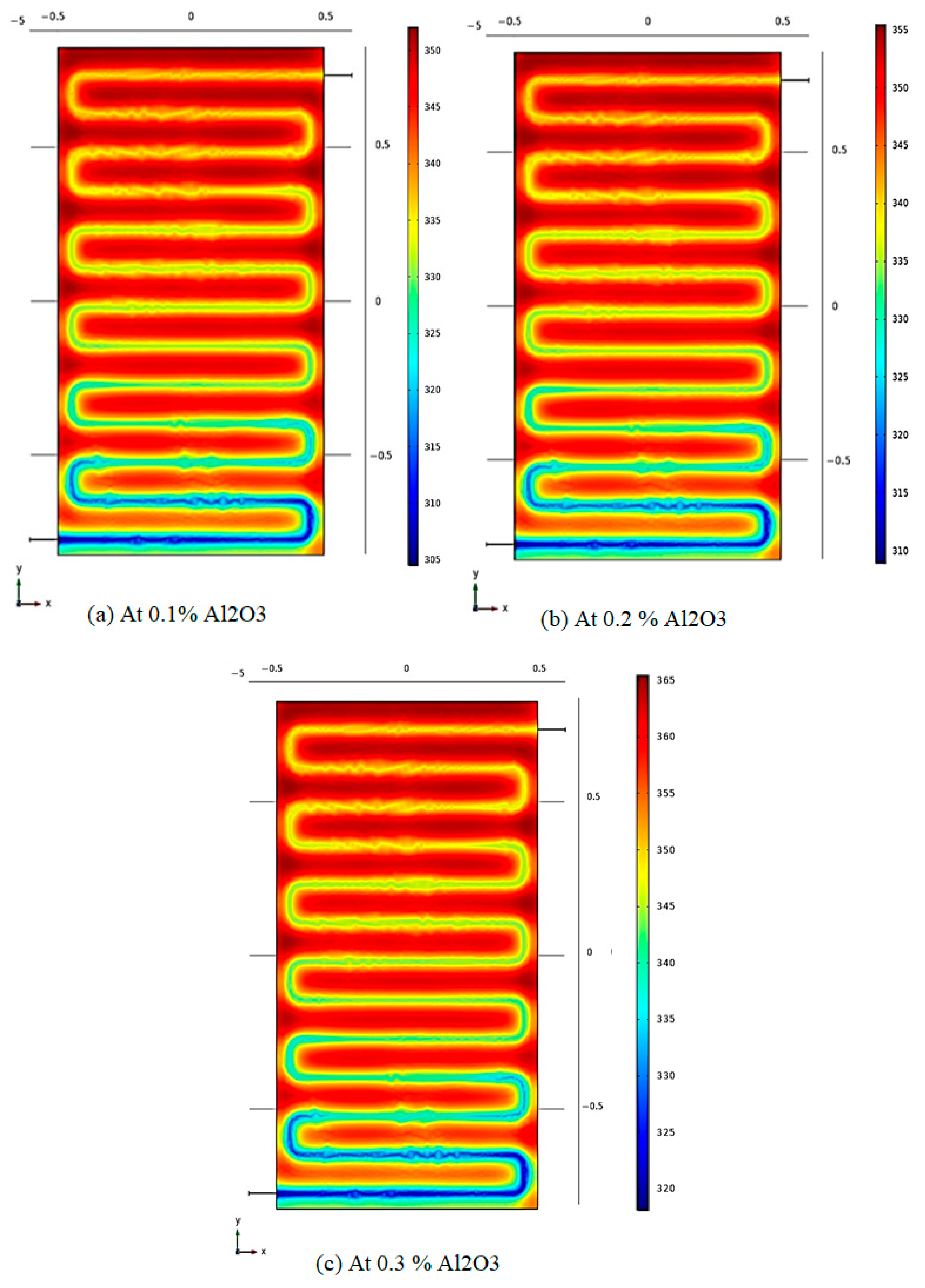 - Numerical results illustrate that higher Al2O3 concentrations improve thermal conductivity, reduce localized hot zones, and promote more efficient, uniform heat transfer in the SWC and EWH models.