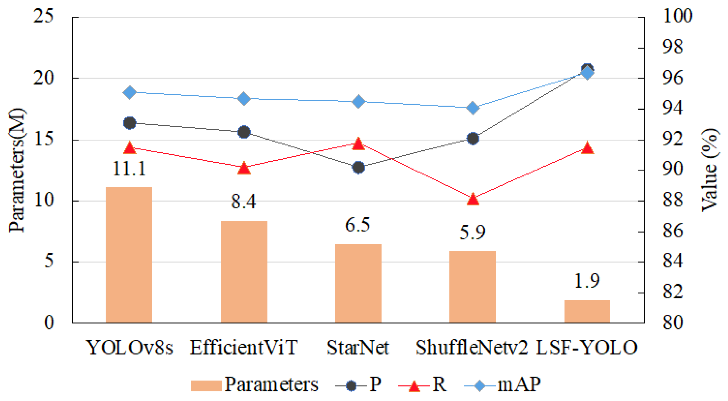 31] models exhibit improved detection speeds, reduced model sizes, and lower computational complexity. However, there is still a need for further enhancements in detection accuracy. In contrast, our proposed LSFE-YOLO model demonstrates superior performance in both mean Average Precision (mAP) and F1 metrics, achieving scores of 96.4% and 94%, respectively. Additionally, this model outperforms others in four lightweight metrics: parameters, model size, GFLOPs, and FPS. When compared to the original YOLOv8s model, LSFE-YOLO shows a significant reduction in complexity, with a model size of 4.1 MB, a calculation amount of 4.5 MB, and the number of parameters reduced to 1.9 M. These figures indicate decreases of 81.9%, 84.2%, and 82.9%, respectively, compared to the original model. The detection speed reaches 116 frames per second, marking a 20.8% increase.