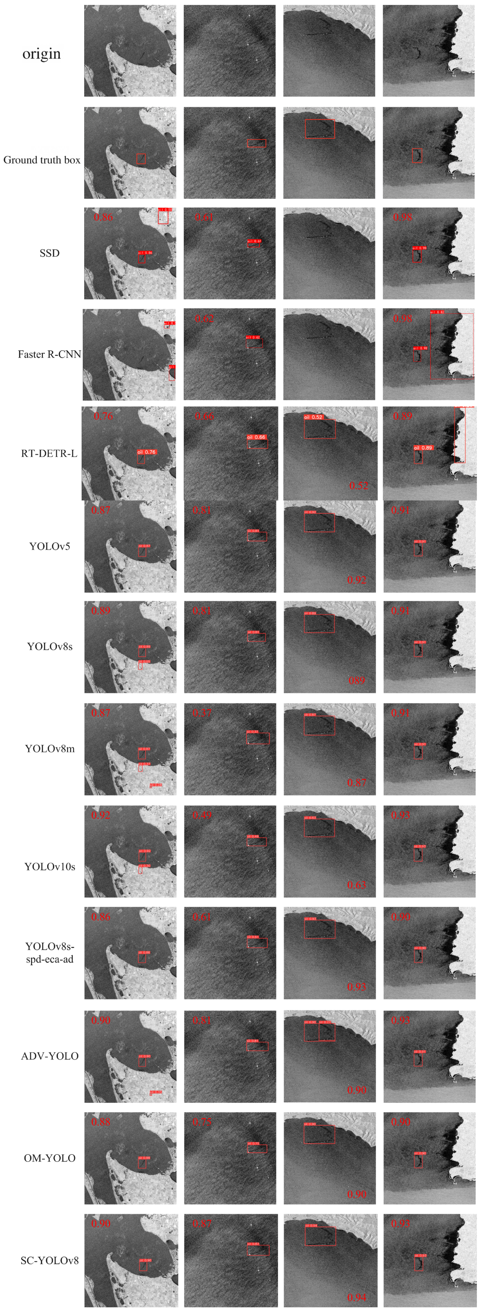 To provide a more intuitive demonstration of the detection effect of the improved algorithm presented, four randomly selected images with oil stains are compared. As