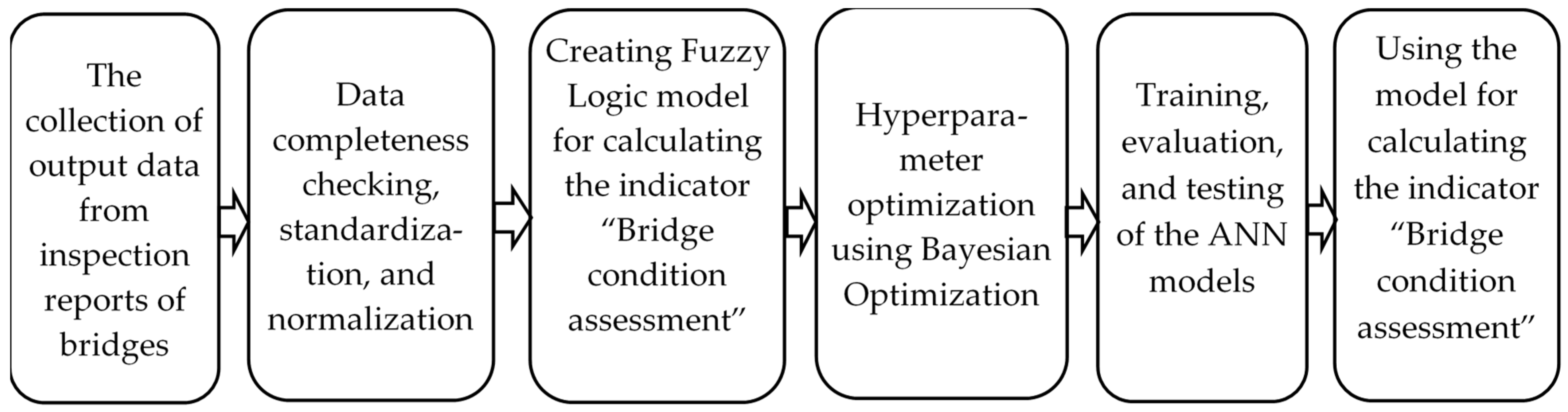 The goal of this study is to develop a hybrid, inspection-data-driven methodology for quantifying bridge technical condition by (1) computing an integrated Bridge Condition Assessment indicator using a fuzzy inference system and (2) training an artificial neural network to predict this indicator with high accuracy, supported by Bayesian hyperparameter optimization.