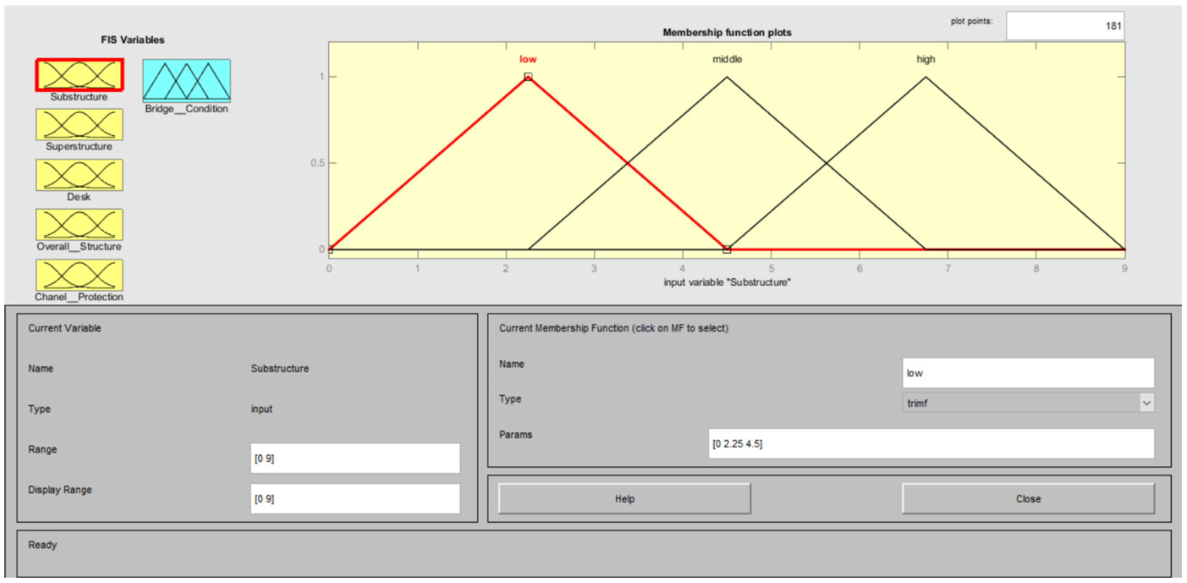 This means that Substructure values close to 2.25 are interpreted as a low condition, a value of 5 has zero membership in the “low” set, strong membership in the “middle” set, and weak membership in the “high” set, while a value of 8 has zero membership in both “low” and “middle” and strong membership in “high”.