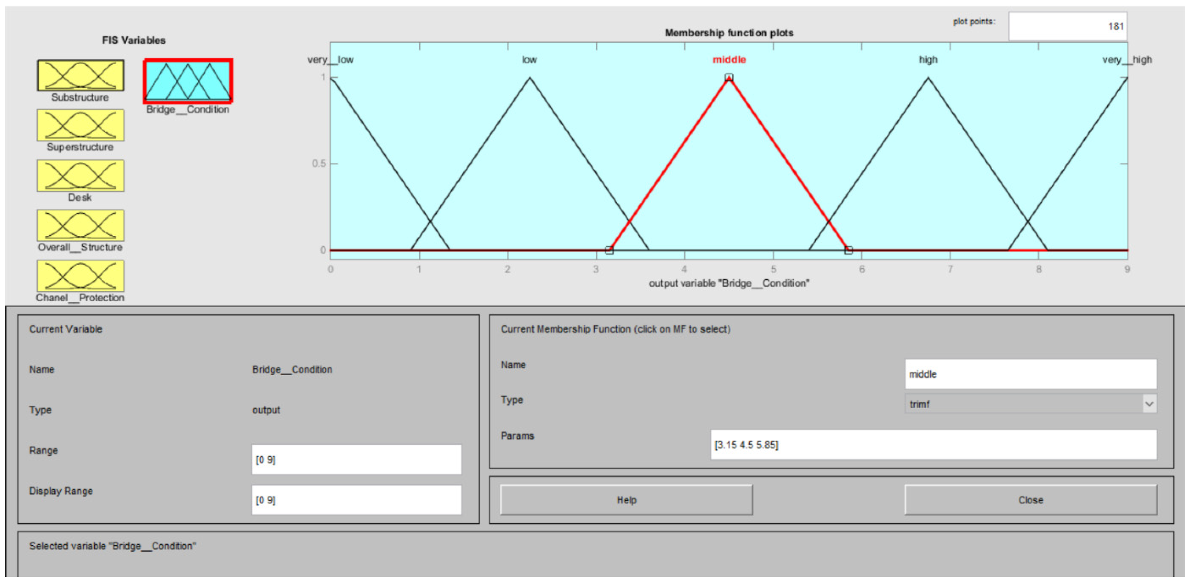 Figure 5). The output variable Bridge_Condition is described by a set of linguistic terms, each associated with a triangular membership function, providing smooth transitions between qualitative condition states. Specifically, the very_low term is defined by the parameters [−1.35, 0.0, 1.35], low by [0.9, 2.25, 3.6], middle by [3.15, 4.5, 5.85], high by [5.4, 6.75, 8.1], and very_high by [7.65, 9, 10.35]. The output membership functions were extended slightly beyond the nominal [0, 9] range to reduce boundary effects during aggregation and centroid defuzzification and to preserve smooth behavior at the extremes. The resulting defuzzified bridge condition assessment values are subsequently interpreted within the 0–9 rating scale. This configuration of membership functions allows for an adequate interpretation of the defuzzification results, ensuring a clear yet flexible classification of the bridge’s technical condition across a wide range of possible values.