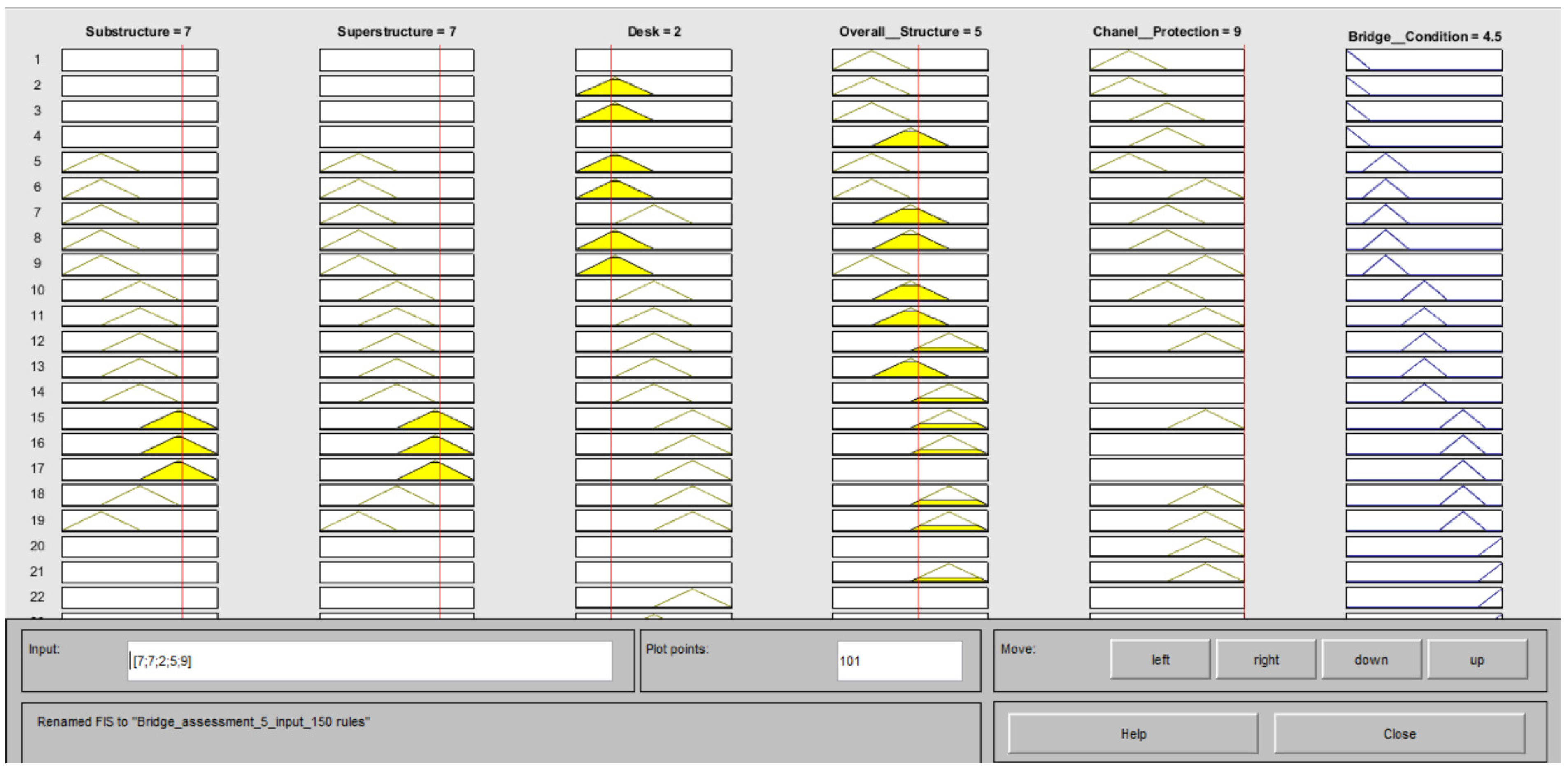 The Bridge Condition Assessment parameter was calculated using fuzzy logic tools implemented in the Fuzzy Logic Toolbox of the MATLAB R2014 software environment.