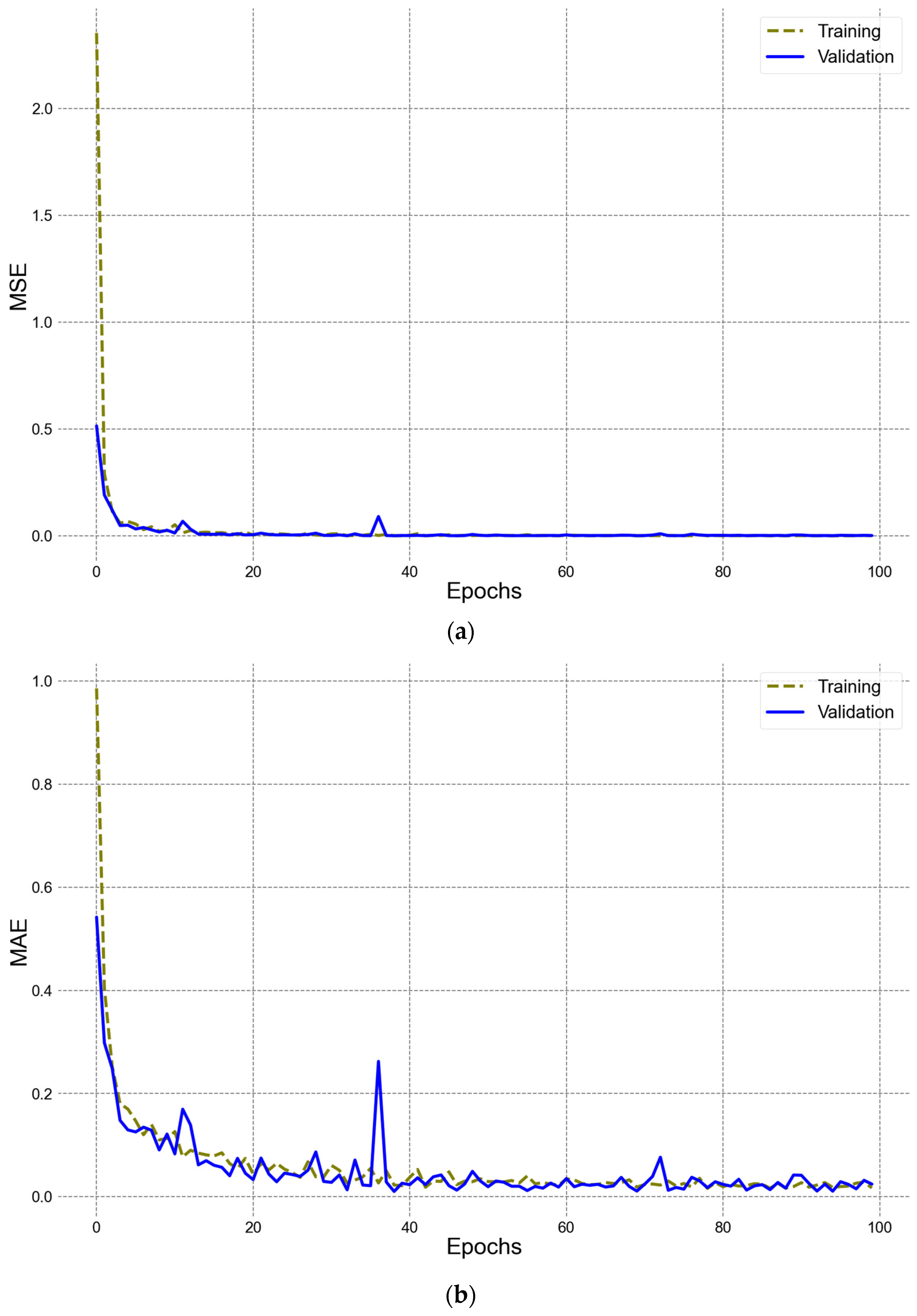 Figure 7 presents a comparison of the mean squared error (MSE) and mean absolute error (MAE) for the training and validation datasets of the model.