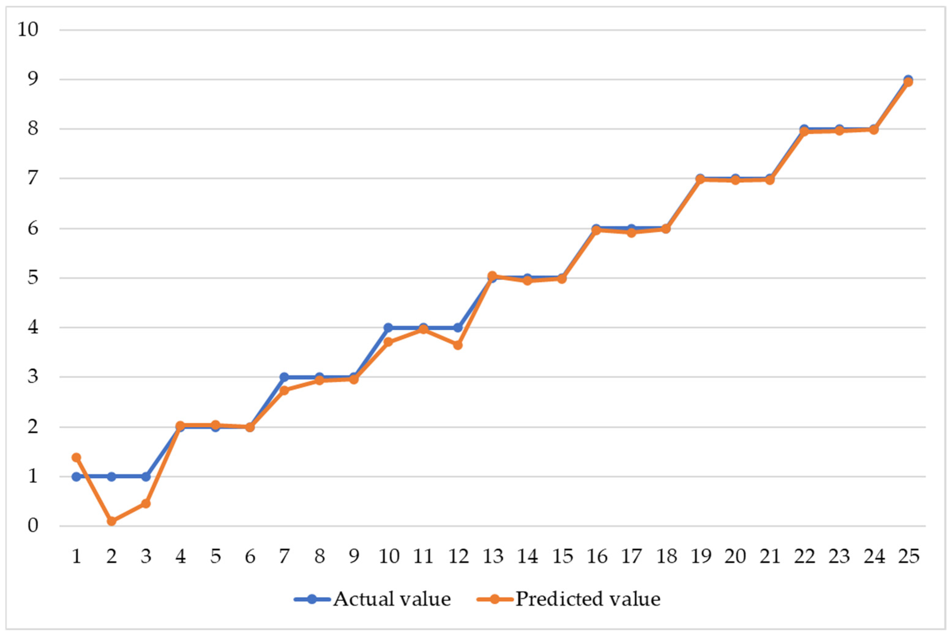 The final stage of the study focuses on evaluating how the trained model predicts the Bridge Condition Assessment indicator and on comparing the predicted values with the actual ones. The dataset used for this evaluation consisted of 25 records, including two samples for each assessment level from 1 to 8 and one sample for level 9 (