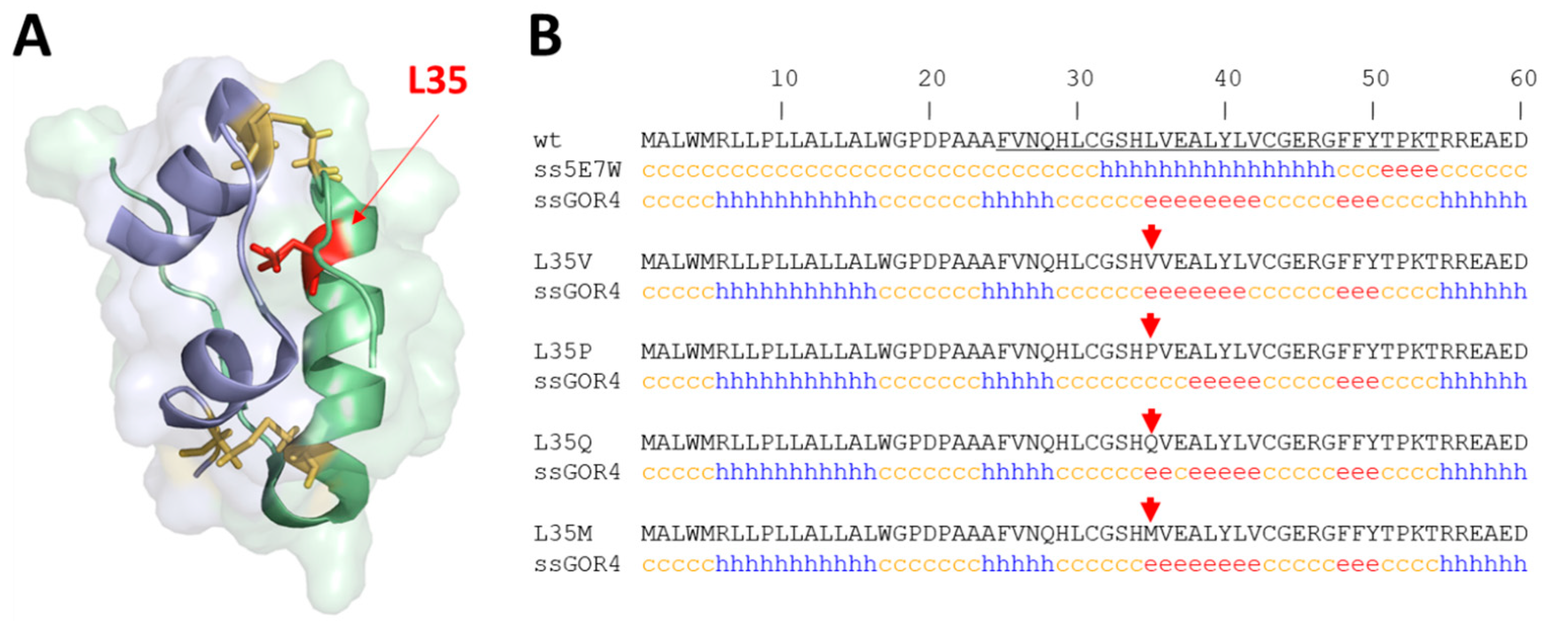 3.3. In Silico Analysis of the Mutations of the L35 Amino Acid Residue of Insulin
