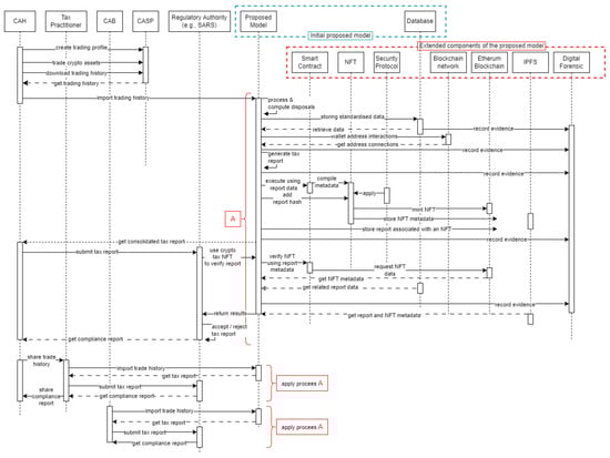 Proposed model sequence diagram. Label “A” represents the process flows triggered when a CAH imports crypto-asset transactions into the proposed model. This sequence of events begins with the ingestion, processing, and computing of transactions or disposals, and proceeds to the generation of a crypto tax report, which is subsequently submitted to the regulatory authority (e.g., SARS) for verification of its authenticity. The same sequence of events applies when the transactions are imported by a tax practitioner or a CAB, hence the use of the notation “apply process A” to avoid duplicating the same procedural steps.