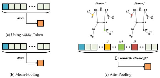Transformer-based models typically output a last_hidden_state of shape [batch, seq, dim], representing the full token sequence. Refs. [34,35] have shown that information within this sequence is often unevenly distributed, with a significant portion concentrated on a few key tokens. To reduce computational cost and dimensionality, it is common to compress the output into a unified vector. Common strategies include prepending a special <CLS> token [36] to the input, where the corresponding output serves as the sequence representation (Figure 2a), and mean-pooling [37], which averages all token embeddings to produce a global feature representation (Figure 2b). However, these strategies often overlook the complex dynamics of human motion, where the contribution of different body parts varies dynamically over time and across different individuals. To mitigate this dilution of critical motion cues, we employ an attn-pooling mechanism to explicitly weigh these spatiotemporal features, ensuring more precise action reasoning.
