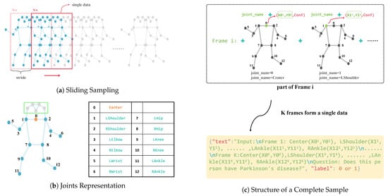 Finally, each sample is formatted as a dictionary: {‘text’: ..., ‘label’: ...}. As illustrated in Figure 3c, the ‘text’ field encodes a temporal textual description derived from K frames of joint data. For each frame, the description includes joint names followed by their (x,y) coordinates, arranged following a predefined indexing scheme. These per-frame descriptions are concatenated in chronological order to form the complete ‘text’ sequence. A task-specific prompt—such as ‘Question: Does this person have Parkinson’s disease?’—is appended to the end of the sequence to guide the model toward the detection task.