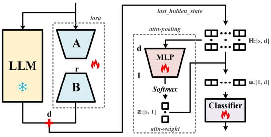To reduce computational costs during the fine-tuning of LLMs, we adopt the Low-Rank Adaptation (LoRA) technique [44]. Since transformer-based LLMs such as Llama [21,23,24,26] rely heavily on self-attention mechanisms, LoRA modules are inserted into key components of the attention blocks, specifically the q_proj, k_proj, v_proj, and o_proj layers. As illustrated in Figure 4 (left), the majority of the original LLM remains frozen during fine-tuning, with updates restricted to the low-rank modules (A and B). This results in a highly efficient training process, updating only 0.15–0.25% of the total trainable parameters (Table 2), thereby substantially reducing the demand for computational resources.
