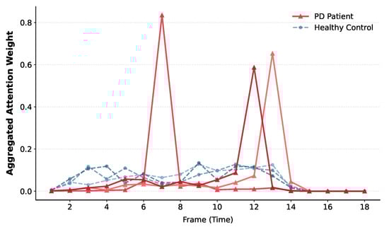 Temporal visualization analysis of attn-pooling mechanism. The red lines represent the frame-wise attention weights for PD patients, while the blue lines represent healthy controls. 3 representative samples are displayed for each group. The distinct peaks in the red lines indicate specific moments where the model focuses on abnormal motion patterns.