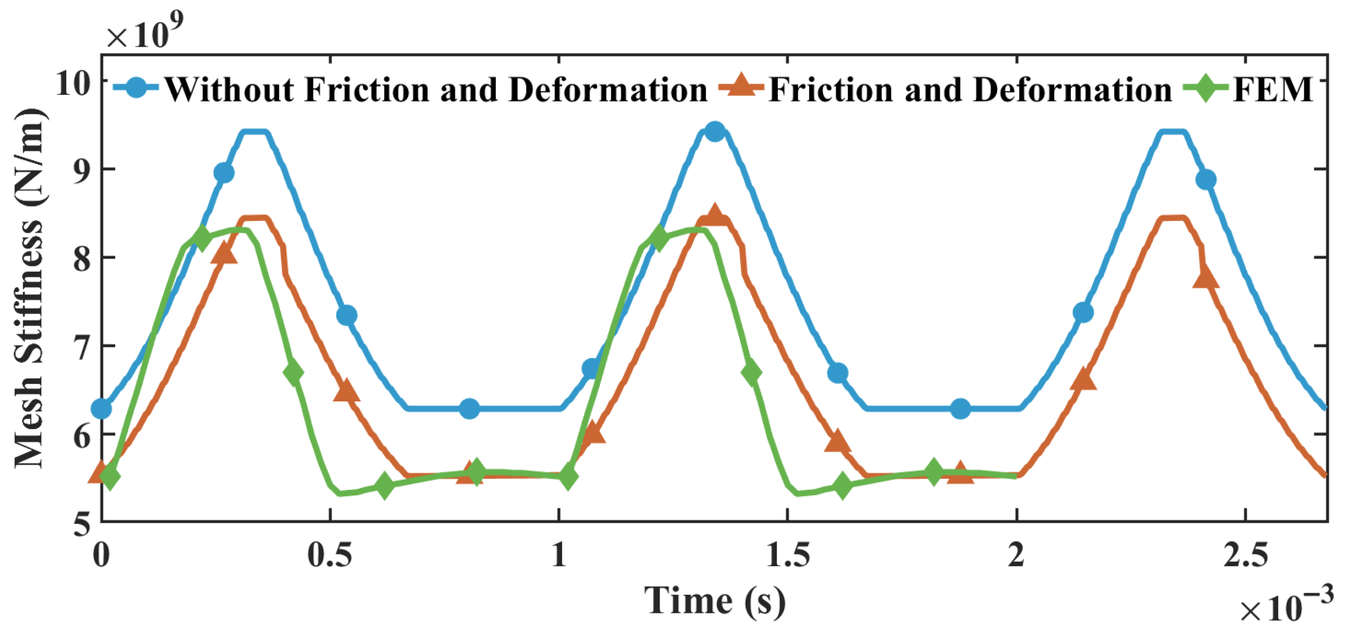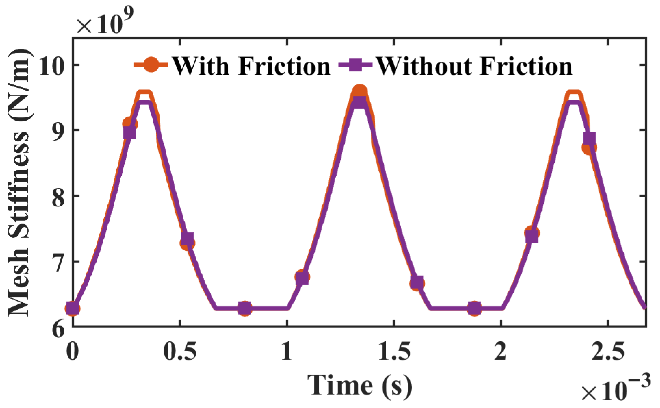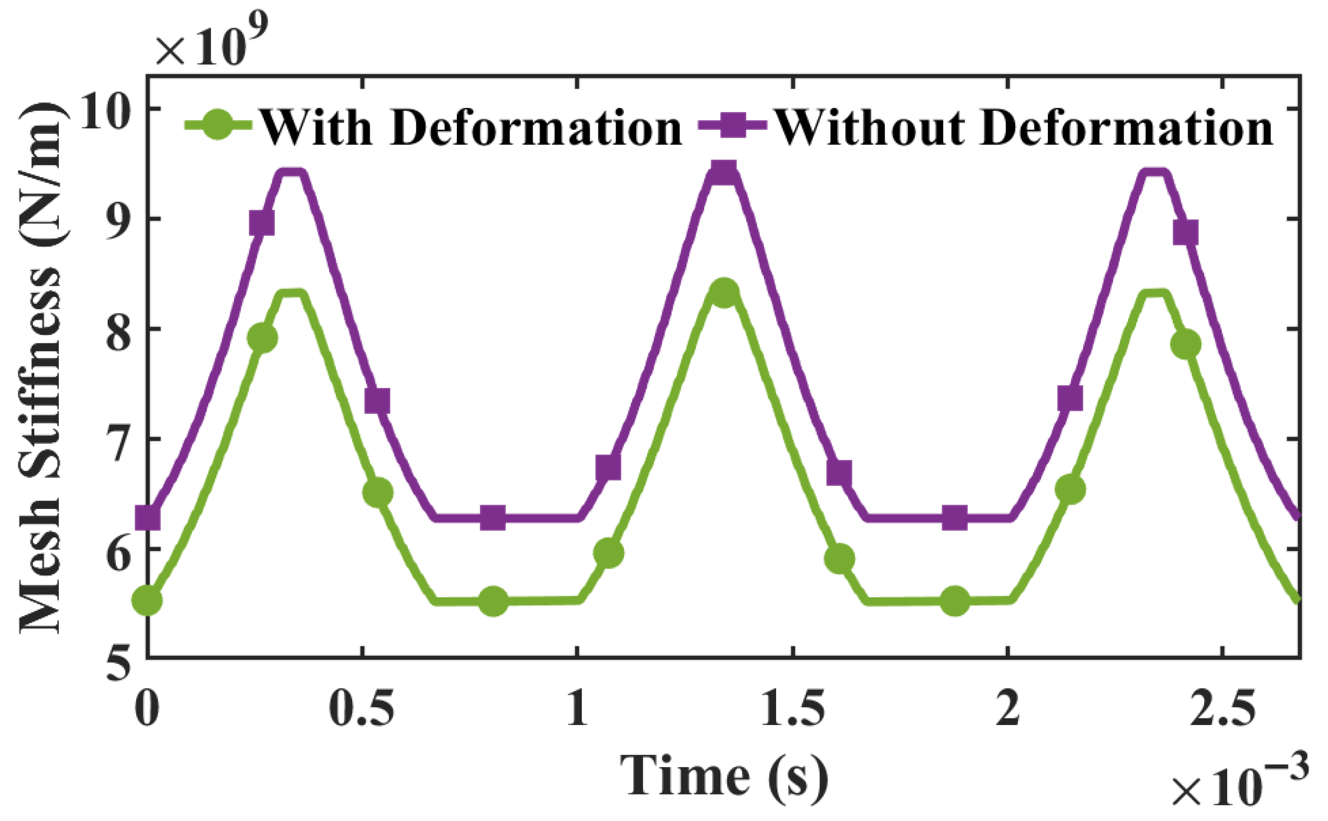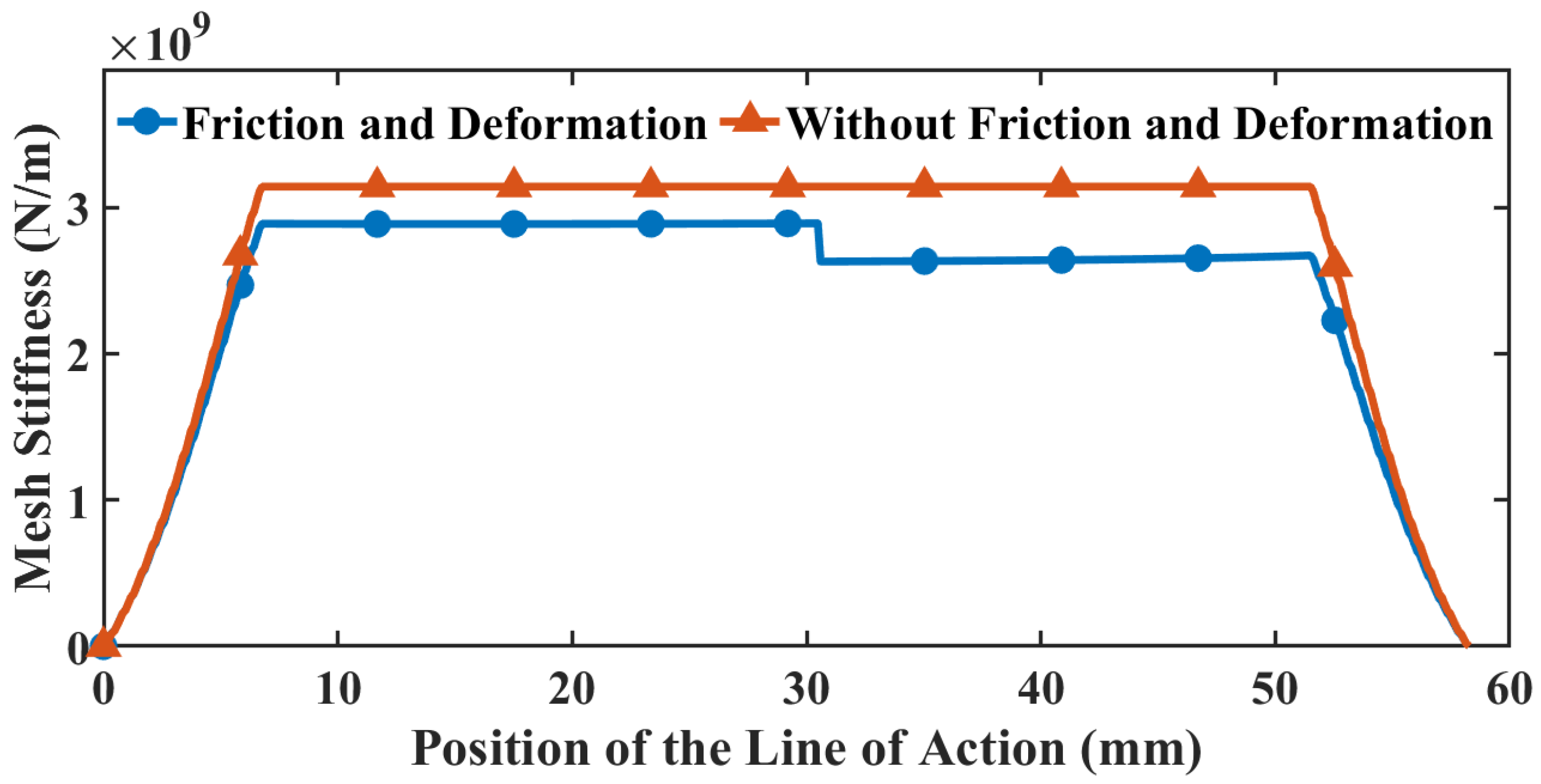 Figure 13 presents the variation curve of meshing stiffness under multi-tooth engagement, accounting for tooth-surface friction and contact point deformation. Comparative analysis reveals that the overall meshing stiffness curve exhibits a noticeable numerical decrease due to the influence of contact deformation. The range of meshing stiffness fluctuations derived from the slice potential energy method spans from