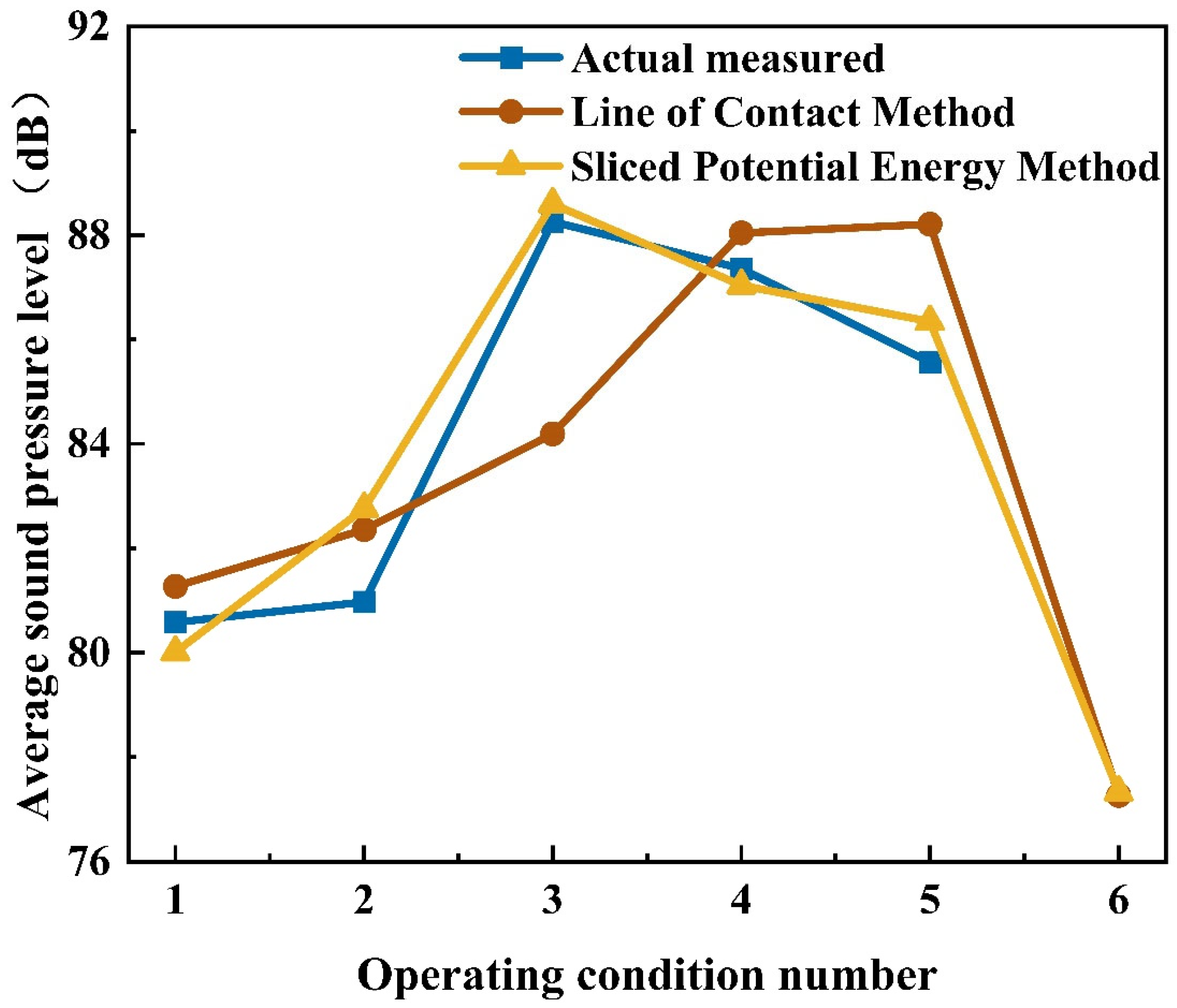 Figure 17 presents the average sound pressure level measured at 4 m from the traction transmission system under six operating conditions, calculated using two theoretical models with different mesh stiffness methods. The six operating conditions are 20 km/h, 30 km/h, 40 km/h, 50 km/h, 60 km/h, and 114 km/h, respectively. To validate the reliability of the method, acoustic test data from actual vehicle measurements were compared with theoretical acoustic calculation results. Analysis shows that as train speed increases, the total sound pressure level obtained by both stiffness calculation methods exhibits a trend of first increasing and then decreasing: the sound pressure level from the contact line method rises from 81.3 dB to 88 dB before falling to 77.3 dB, while that from the optimized slice potential energy method increases from 80 dB to 88.6 dB and then declines to 77.3 dB. Observation reveals that the experimentally measured sound pressure level rises from 80.5 dB to 88.3 dB before decreasing to 85.56 dB, matching both the magnitude and trend of the two theoretical methods. Notably, the maximum discrepancy between the contact line method and the measured data occurs under operating condition 3, where the theoretical value is 84.2 dB and the measured value is 88.3 dB, with a maximum error within 5%. In contrast, the maximum deviation for the optimized slice potential energy method appears under operating condition 2, with a theoretical value of 82.76 dB and a measured value of 80.97 dB, resulting in a maximum error of only 2.2%. Beyond this, the results of the optimized slice potential energy method align more consistently with the actual trend, and its sound pressure level peak occurs under operating condition 3, consistent with the real-vehicle test data. Combined with the comparative results in