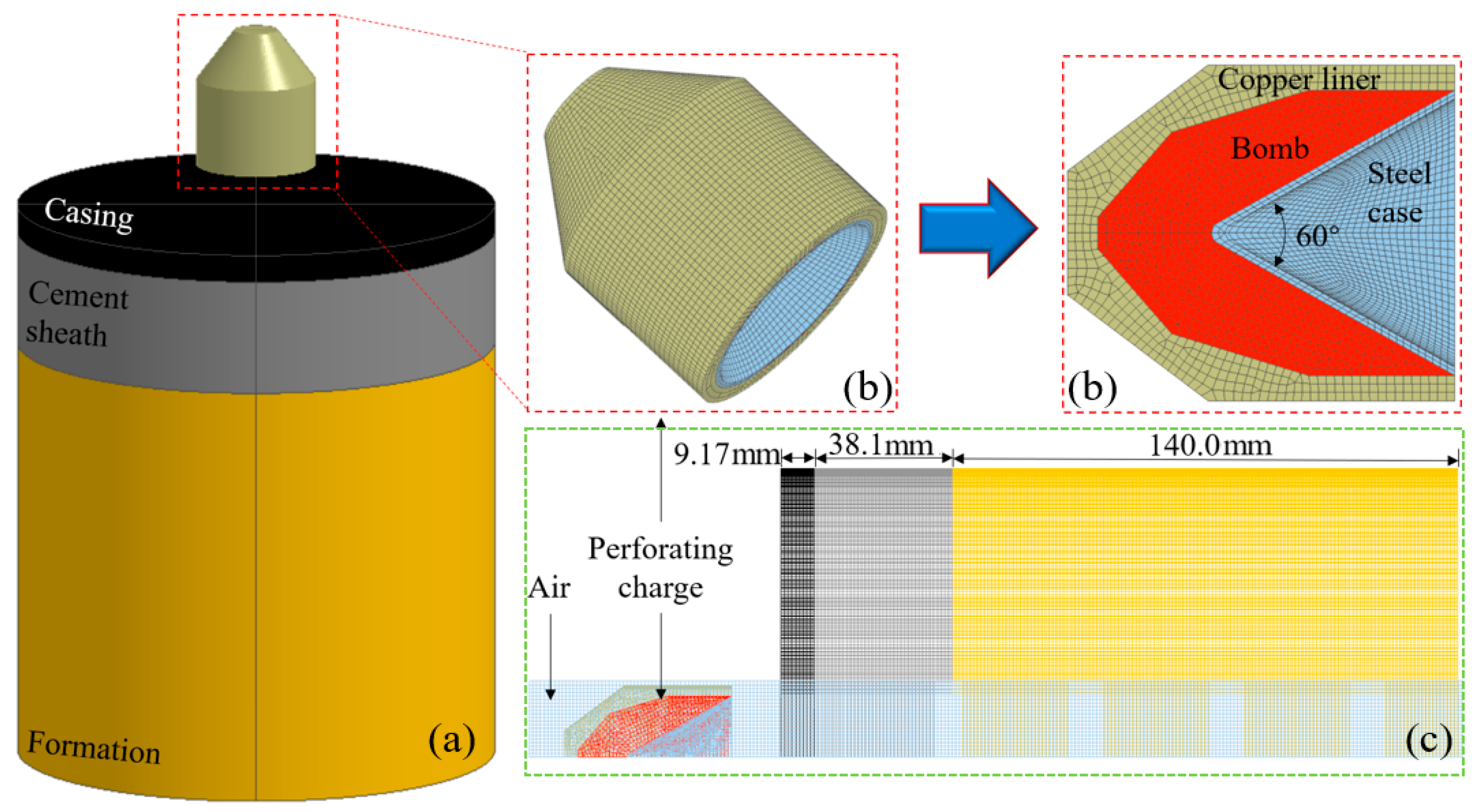 - Liu, J.; Guo, X.Q.; Liu, Z.J.; Liu, X.; Liu, Q.Y. Pressure field investigation into oil&gas wellbore during perforating shaped charge explosion. J. Pet. Sci. Eng. 2019, 172, 1235–1247. [Google Scholar] [CrossRef]