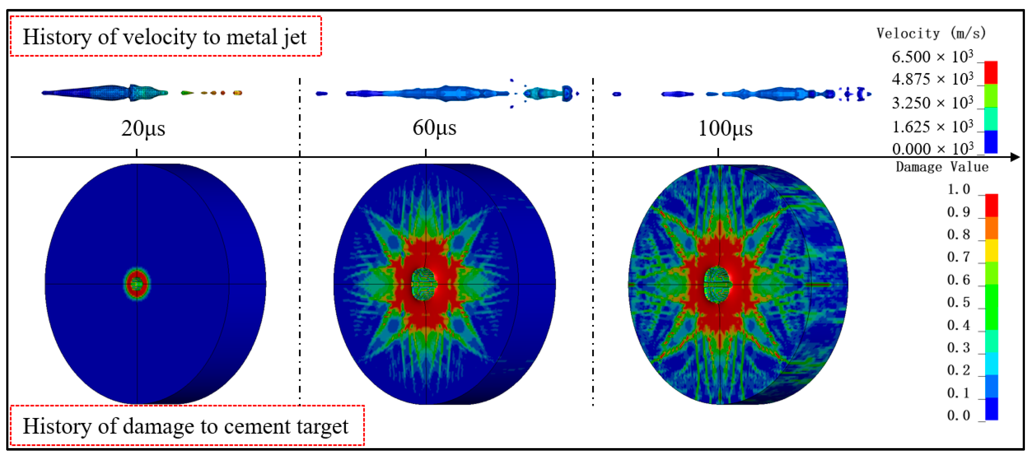 - A numerical model of high-speed jet penetration through the casing–cement target–formation assembly was developed using fluid–structure interaction algorithms. The evolution of metal jet morphology during perforation was analyzed, along with its impact on the inner and outer walls of the cement target during penetration, revealing the aperture variation patterns within the cement target.