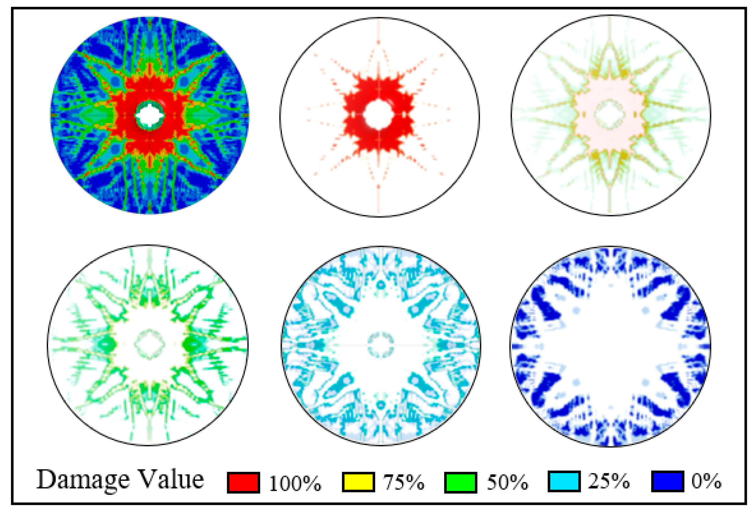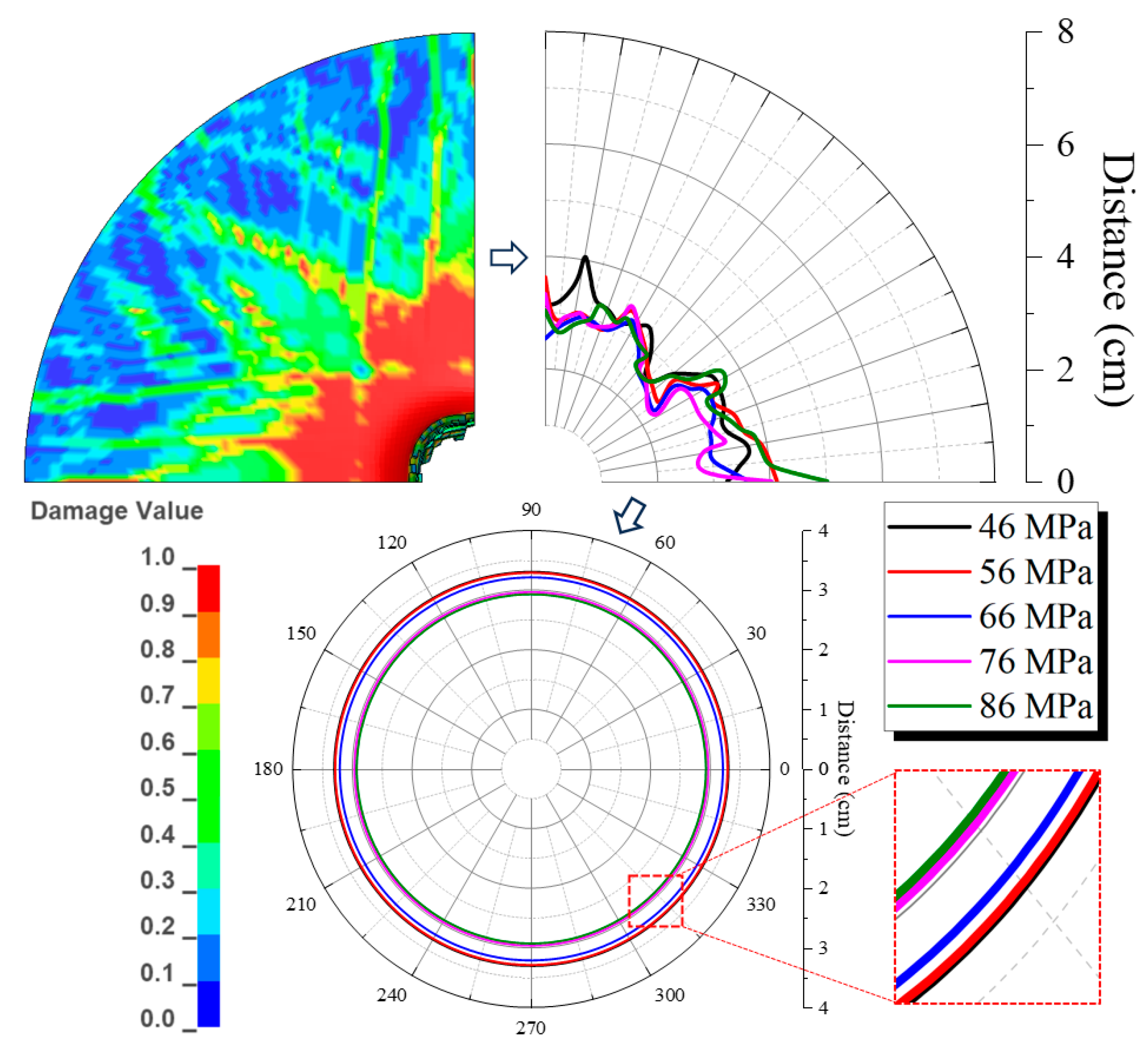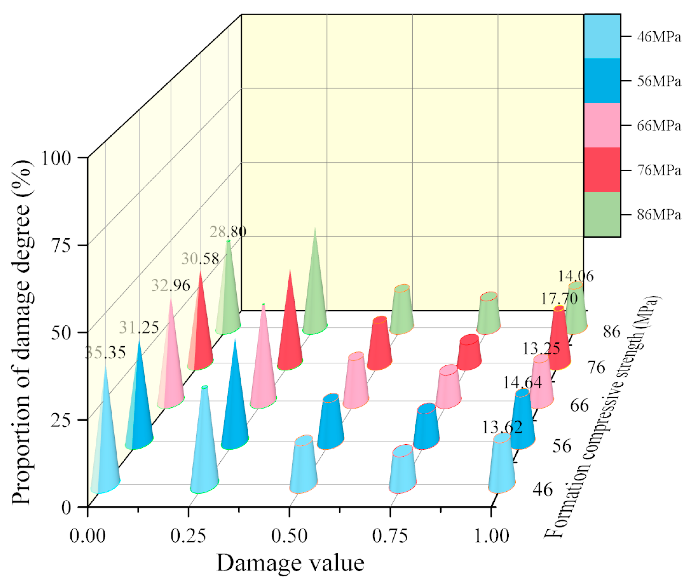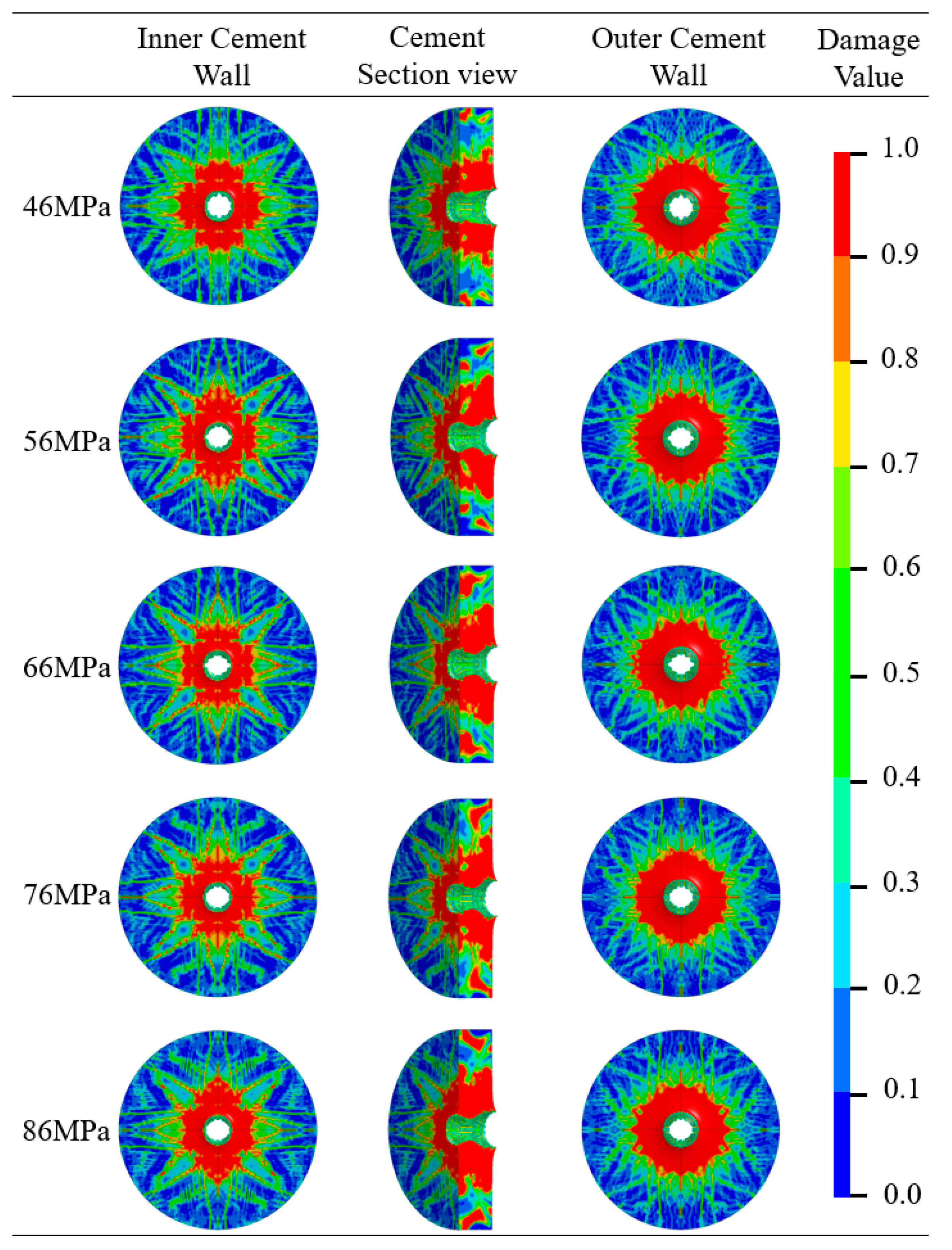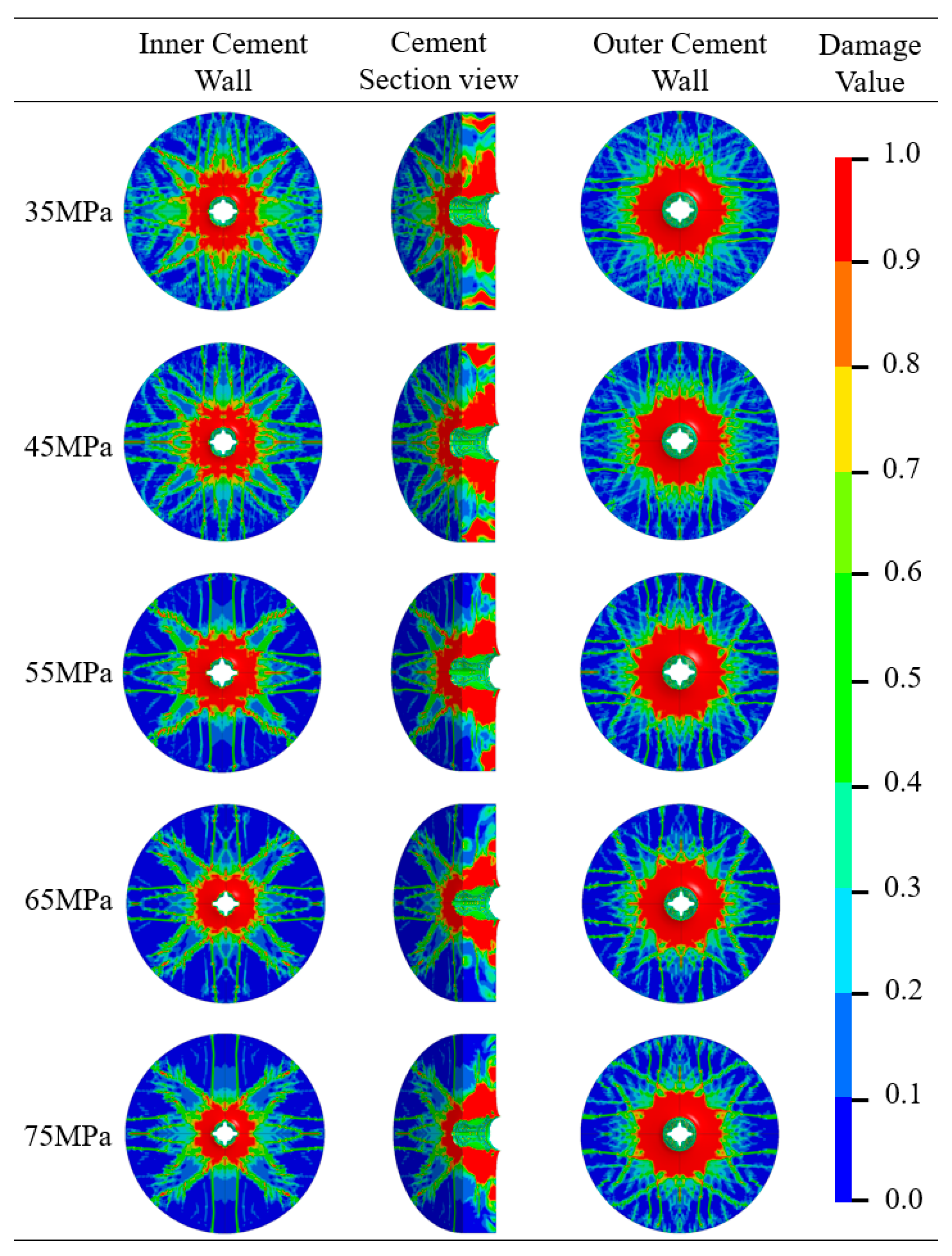 - From Figure 9, it can be seen that as the compressive strength of the cement material increases, the variation law of the damage degree of the outer wall of the cement target is the same as that of the inner wall. Still, the trends in the undamaged and failed areas at the outer wall are weaker than those at the inner wall, indicating that the effect of cement compressive strength on the inner wall is stronger than that on the outer wall.