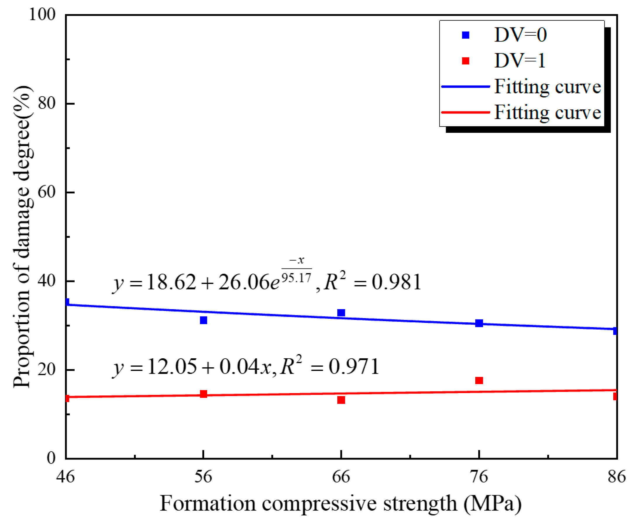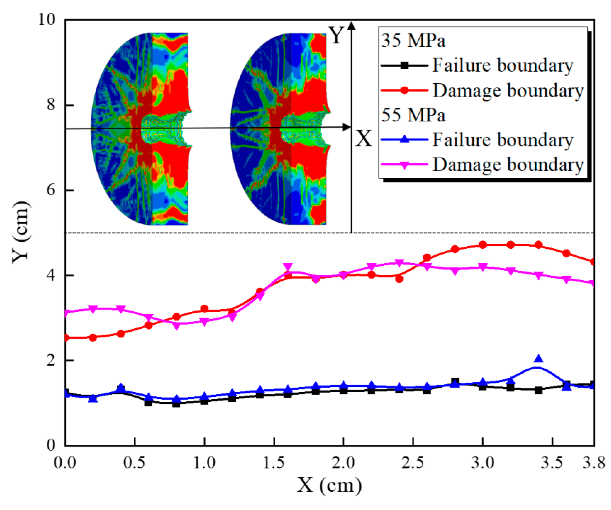 - As the compressive strength increases (35 MPa to 75 MPa), the degree of damage at the inner wall shows a significant decrease, and the number of microcracks decreases significantly; however, the reduction in damage at the outer wall is not apparent. This phenomenon also indicates that the damage at the outer wall is mainly tensile and shear failure. Figure 6 shows the variation law of the perforation tunnel radius and damage radius along the jet direction for cement targets with 35 MPa and 55 MPa compressive strength.