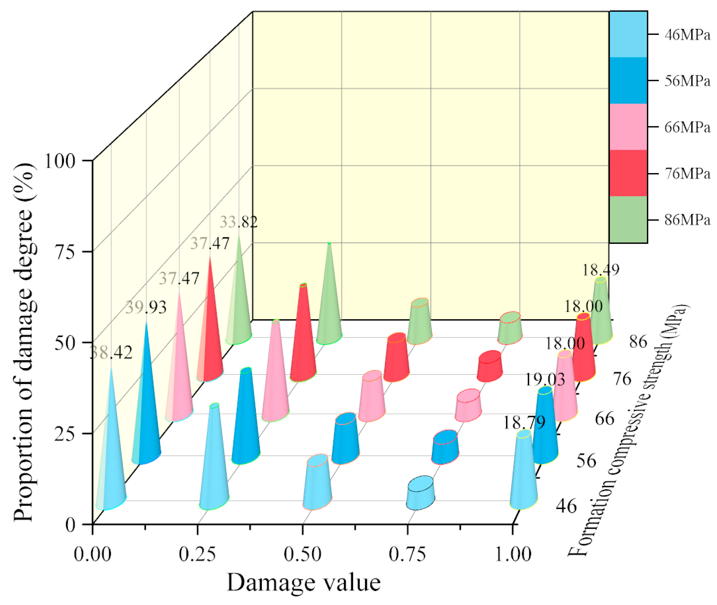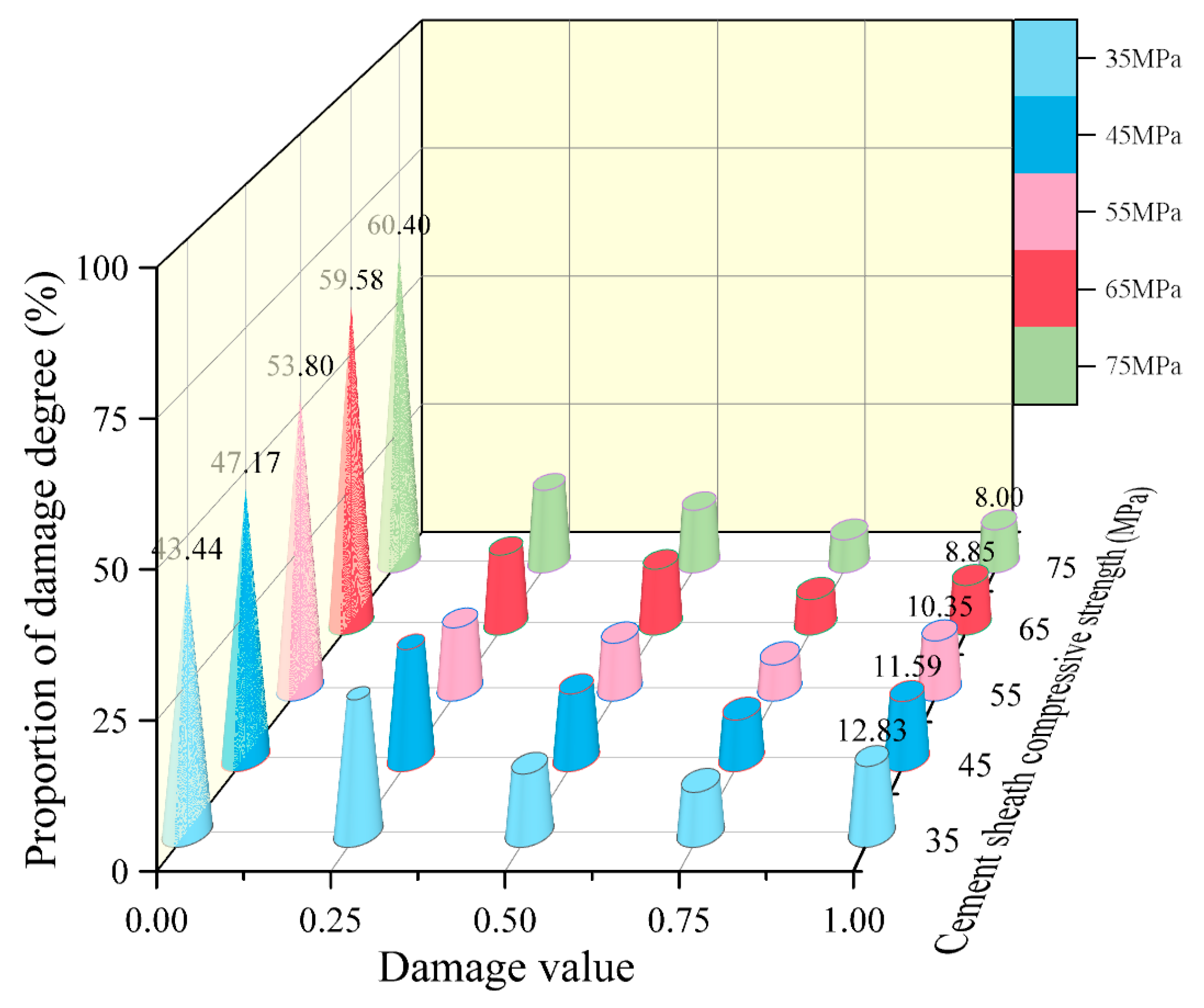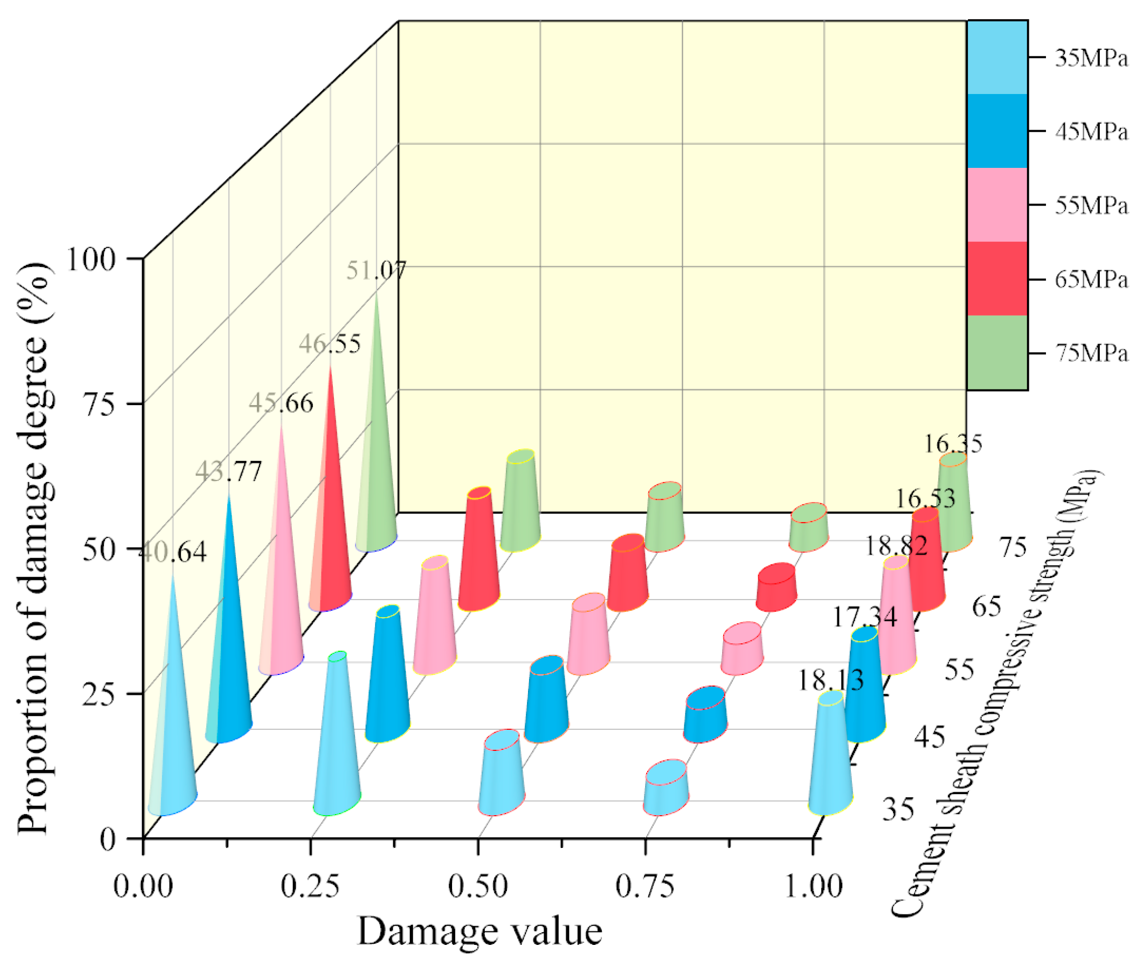 - Figure 8 demonstrates a positive correlation between the cement’s compressive strength fc and the undamaged area at the inner wall, consequently indicating a reduction in interface damage. For instance, at fc = 75 MPa, the undamaged area accounts for 60.4%, with only 8% classified as failed, underscoring the role of high compressive strength in mitigating damage. An anomaly, however, is observed at fc = 55 MPa, where the failed area exceeds that at fc = 45 MPa, suggesting a potential non-monotonic or threshold-dependent relationship that requires further experimental verification.