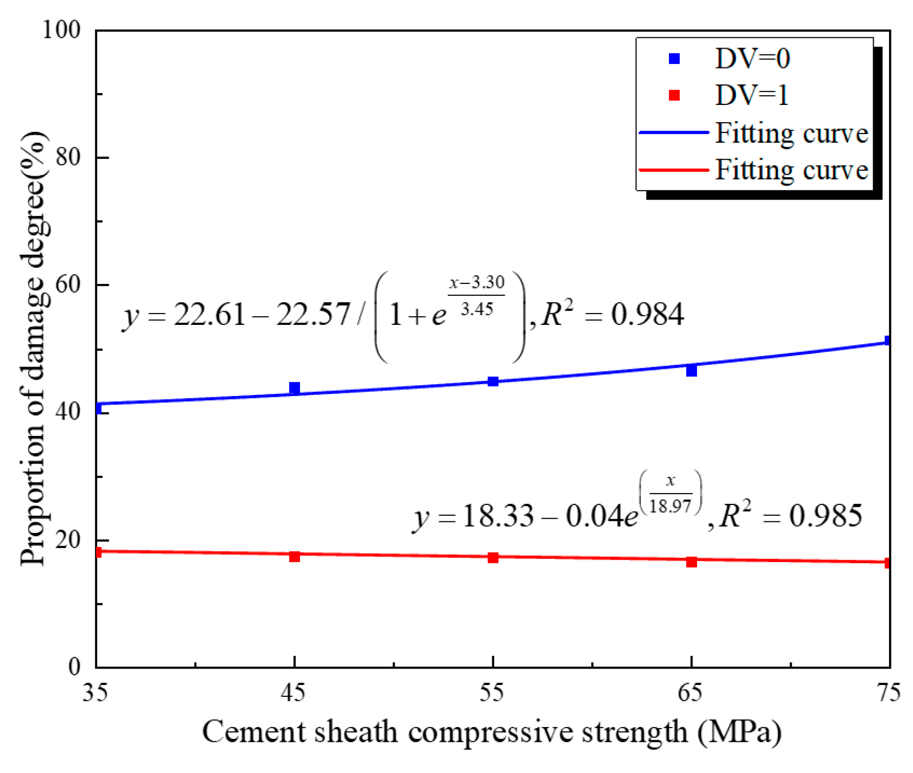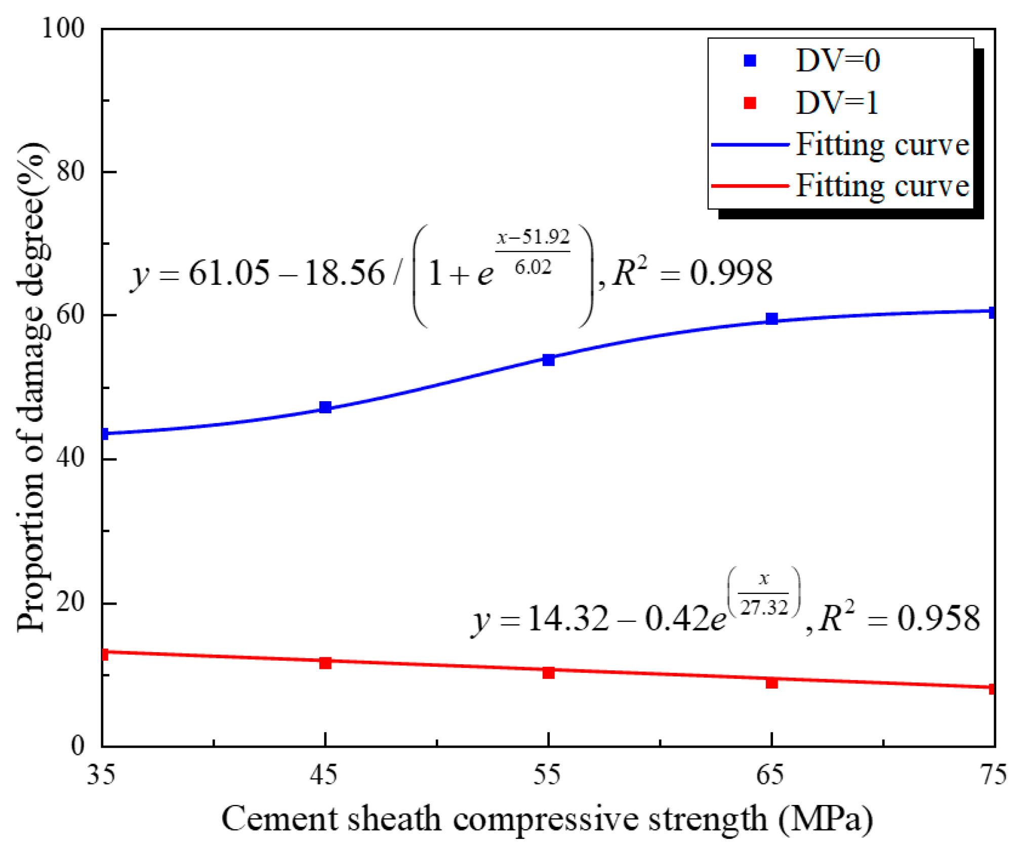 - The comparative data from Figure 8 and Figure 9 reveal that, for an equivalent cement compressive strength, the complete failure area at the outer wall substantially exceeds that at the inner wall. This marked disparity is exemplified at fc = 75 MPa, where the proportion of complete failure area at the outer wall (16.44%) is more than twice that of the failure area at the inner wall (8.00%).