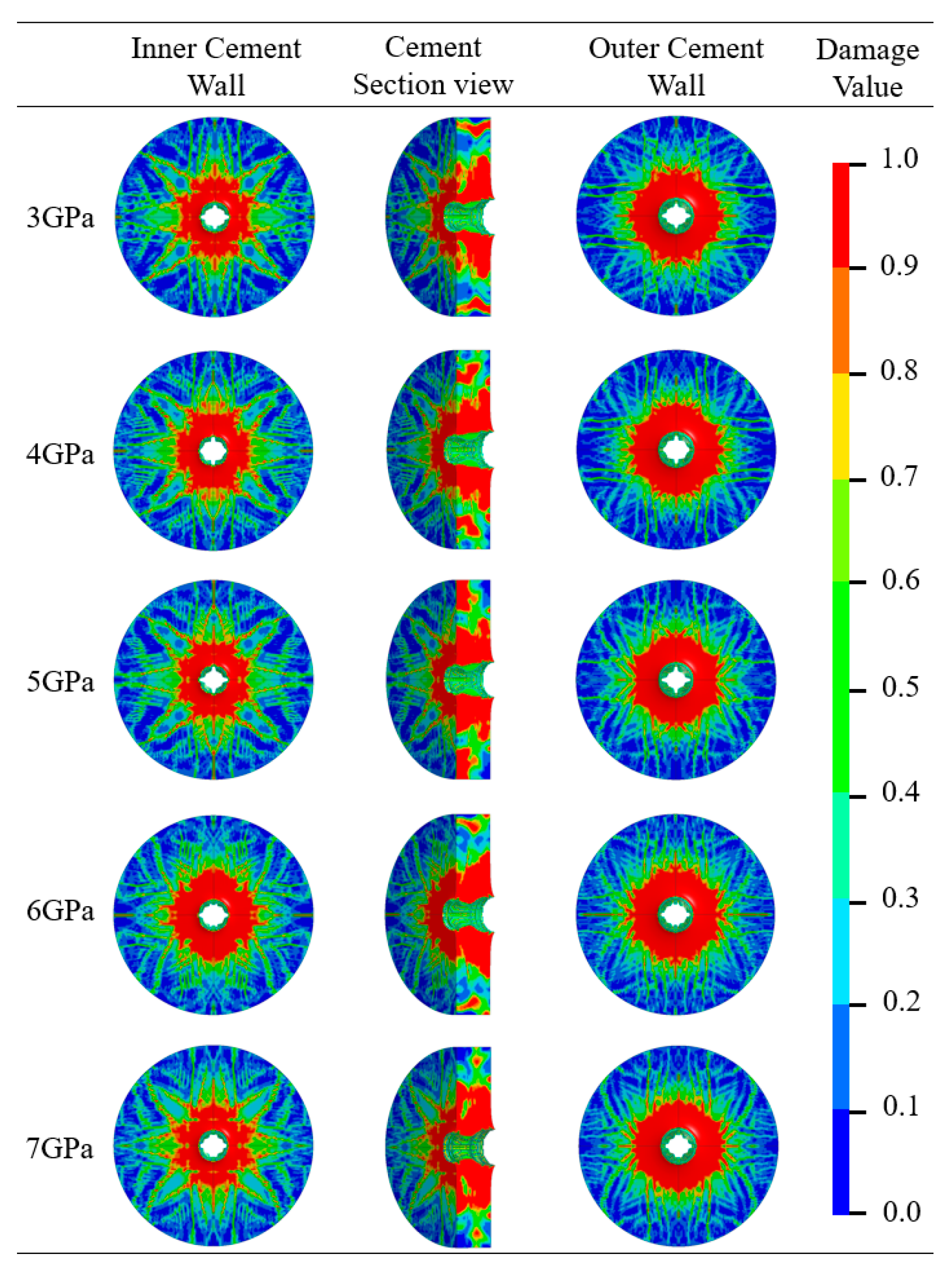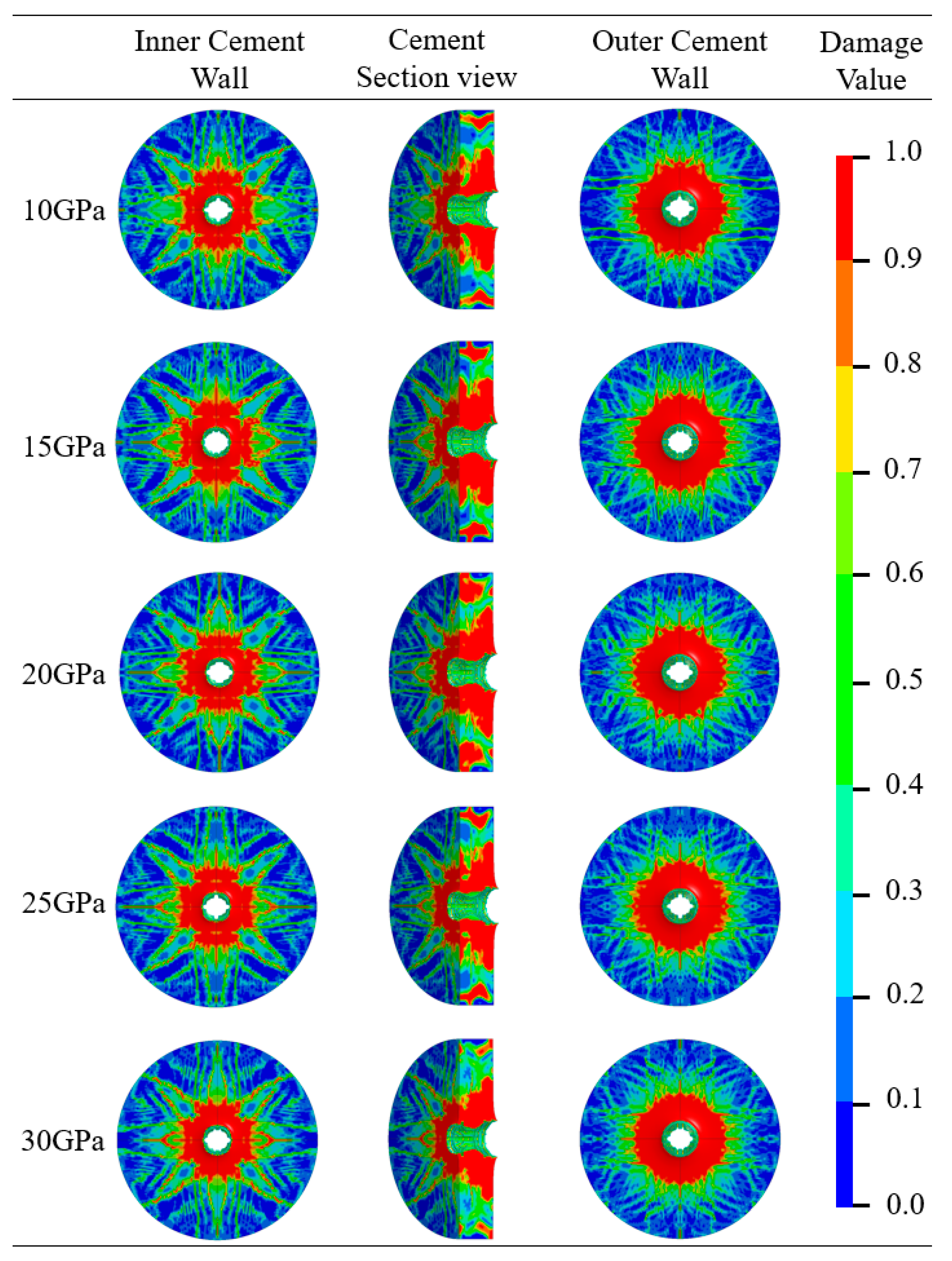 - It is worth noting that when G = 5 GPa, the proportions of failed area at the inner and outer walls of the cement target are both the smallest, at 12.55% and 17.54%, respectively. Therefore, a cement material with G = 5 GPa can be selected to prevent wellbore sealing failure due to severe cement target failure after perforation.
