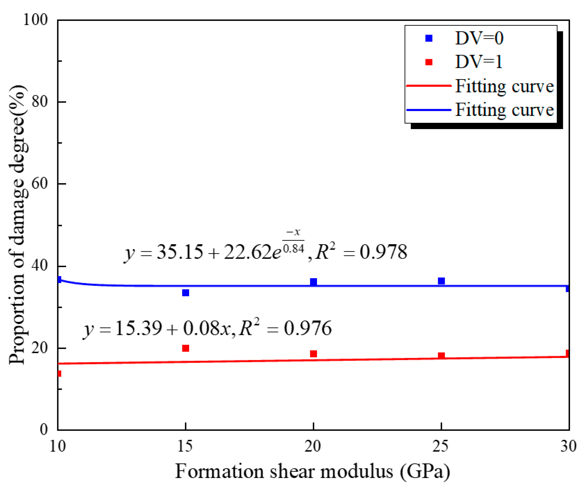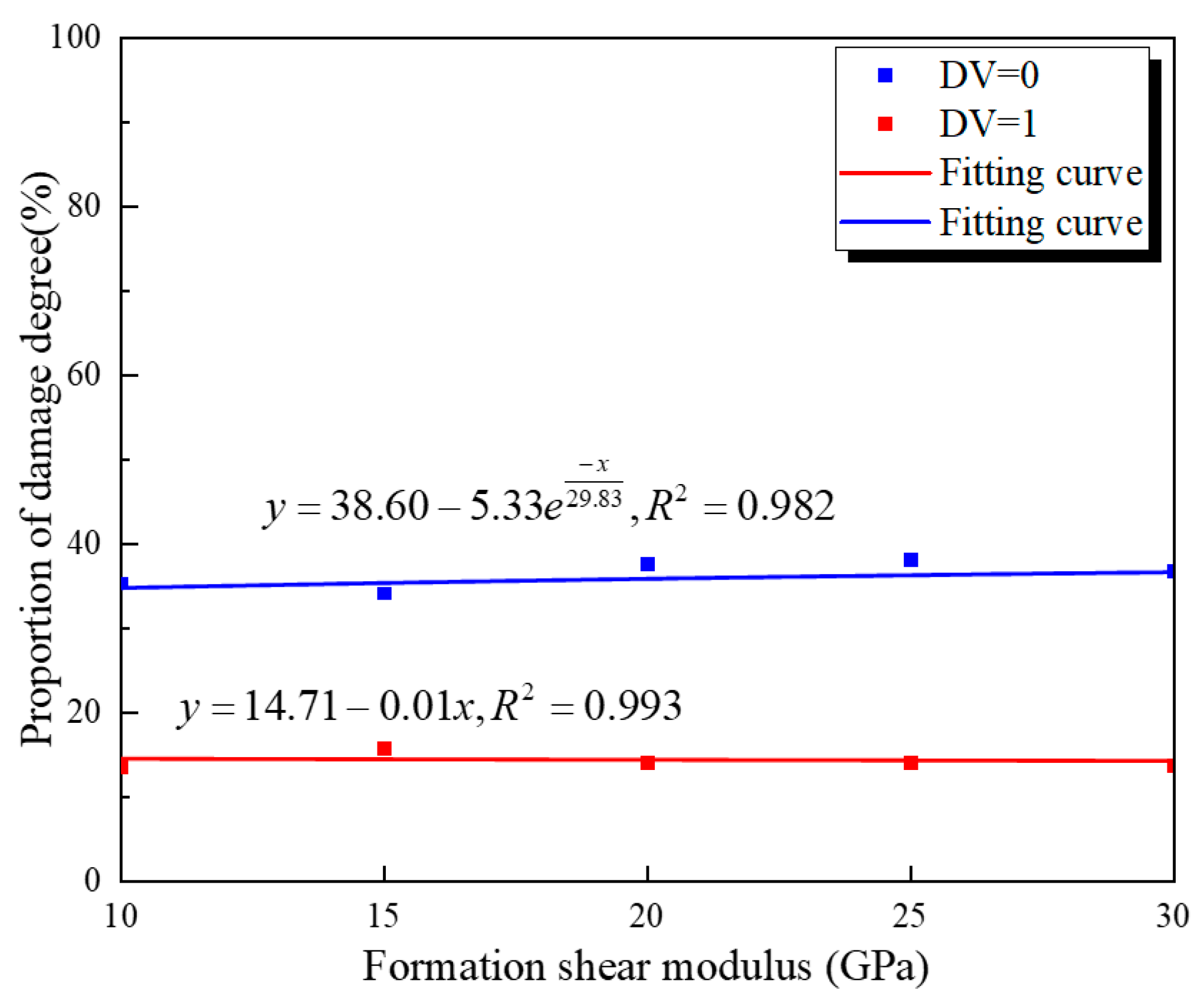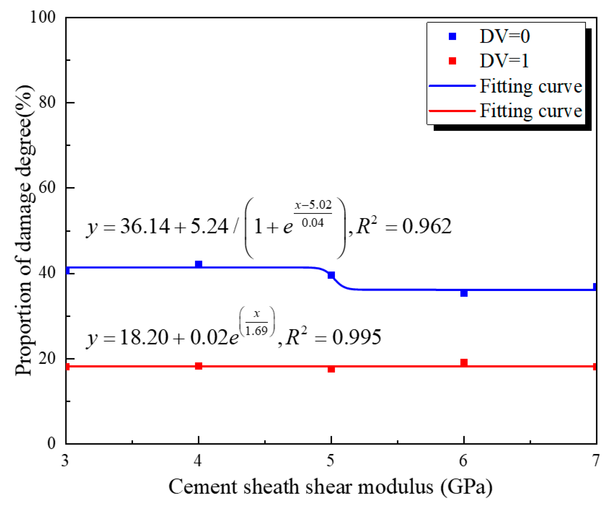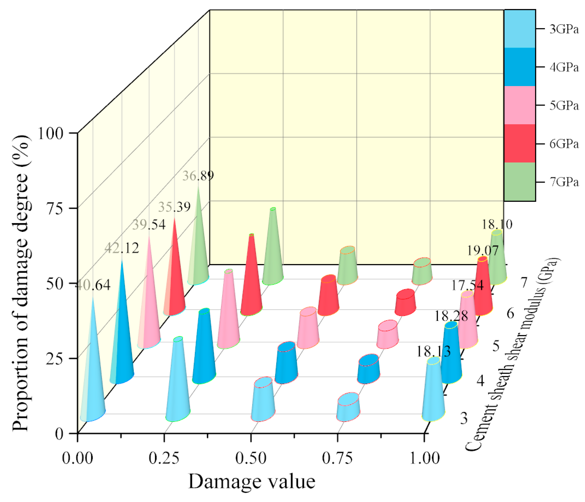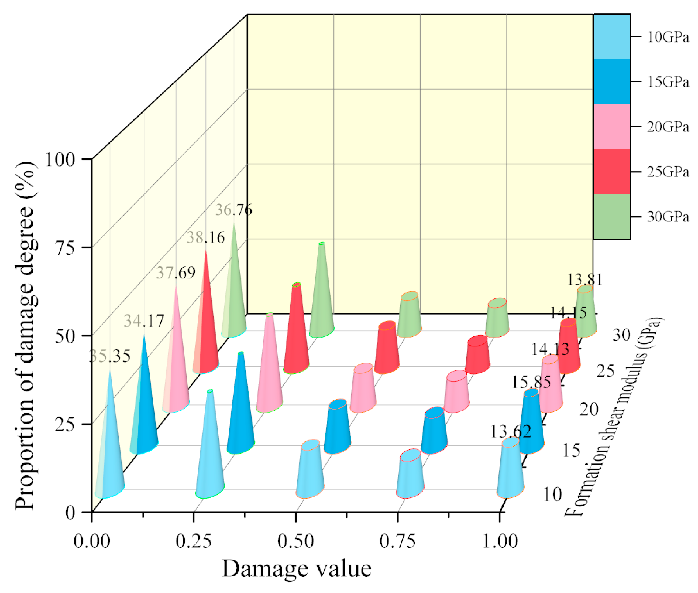 - Figure 14 shows the relationship between the outer cement wall’s damage degree and the shear modulus. From this figure, it can be seen that the variation pattern of the outer wall with the cement material shear modulus is the same as that of the inner wall. High shear modulus leads to increased interface damage intensity, while low shear modulus can limit the development of microcracks.