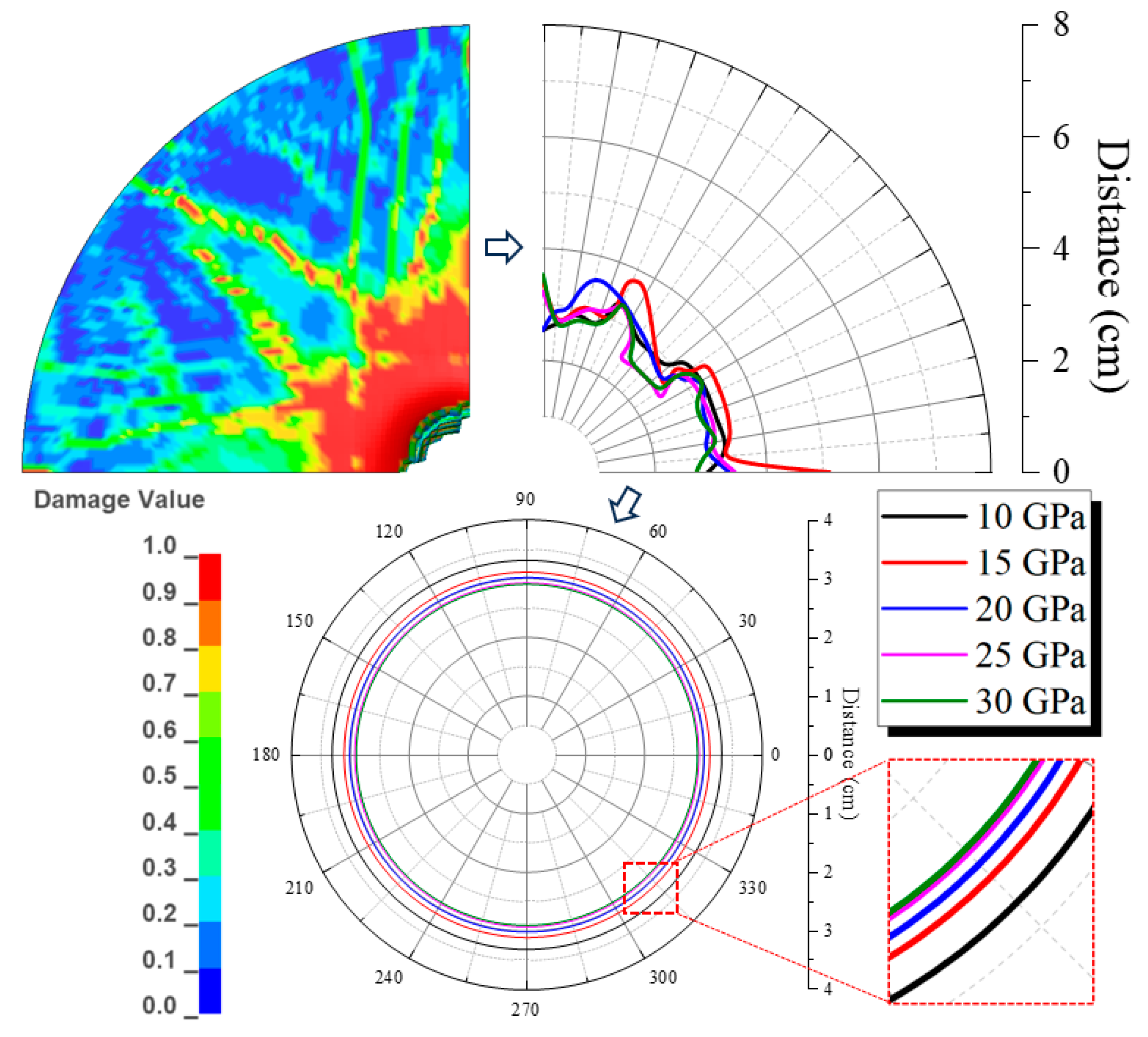 - The relationship between the inner cement wall’s damage degree and the shear modulus is presented in Figure 13. The data reveal an inverse correlation: as the cement’s shear modulus increases, the undamaged area at the inner wall progressively contracts, signifying aggravated damage. This trend is further corroborated by the propensity for high-shear-modulus cement to generate a greater density of micro-cracks, a phenomenon consistent with the observed mechanical response despite the stable proportion of the fully failed area.