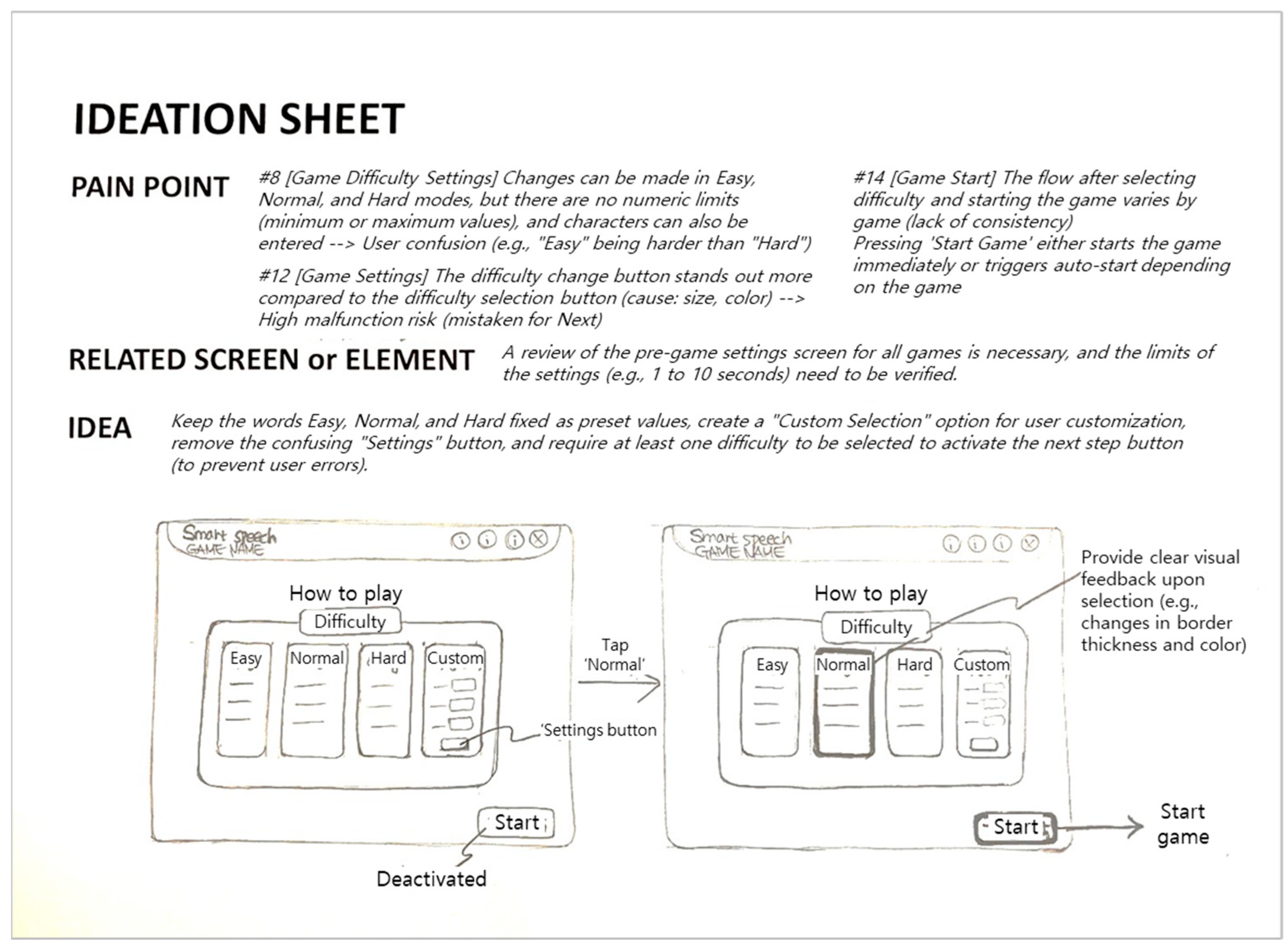 | 1 | Lack of usage instructions | [Game selection] Users face difficulty selecting appropriate games, difficulty levels, or training durations due to unclear or hidden instructions. |