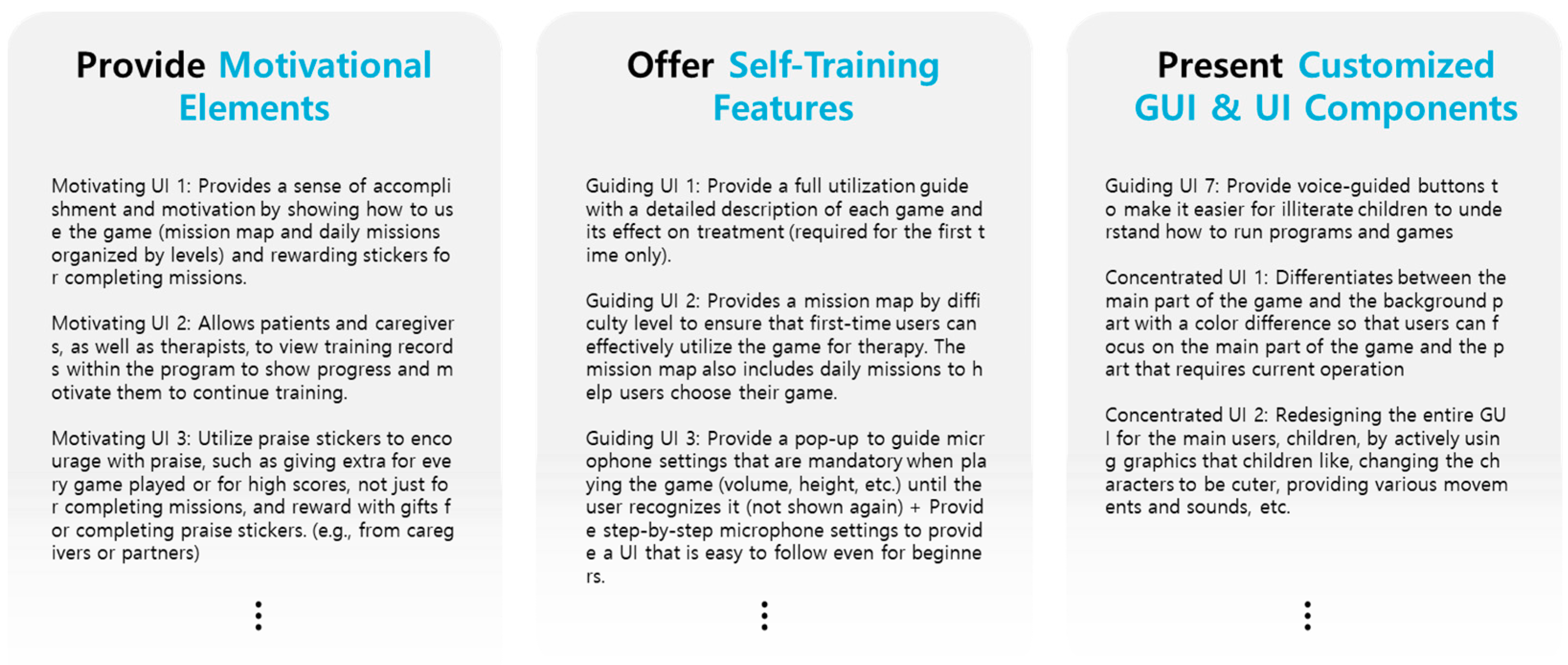 | 2 | Lack of motivation & recurring errors | [Game outcome] When tasks require increased effort (e.g., sustaining vocalization), insufficient motivational elements reduce user engagement and persistence. |
