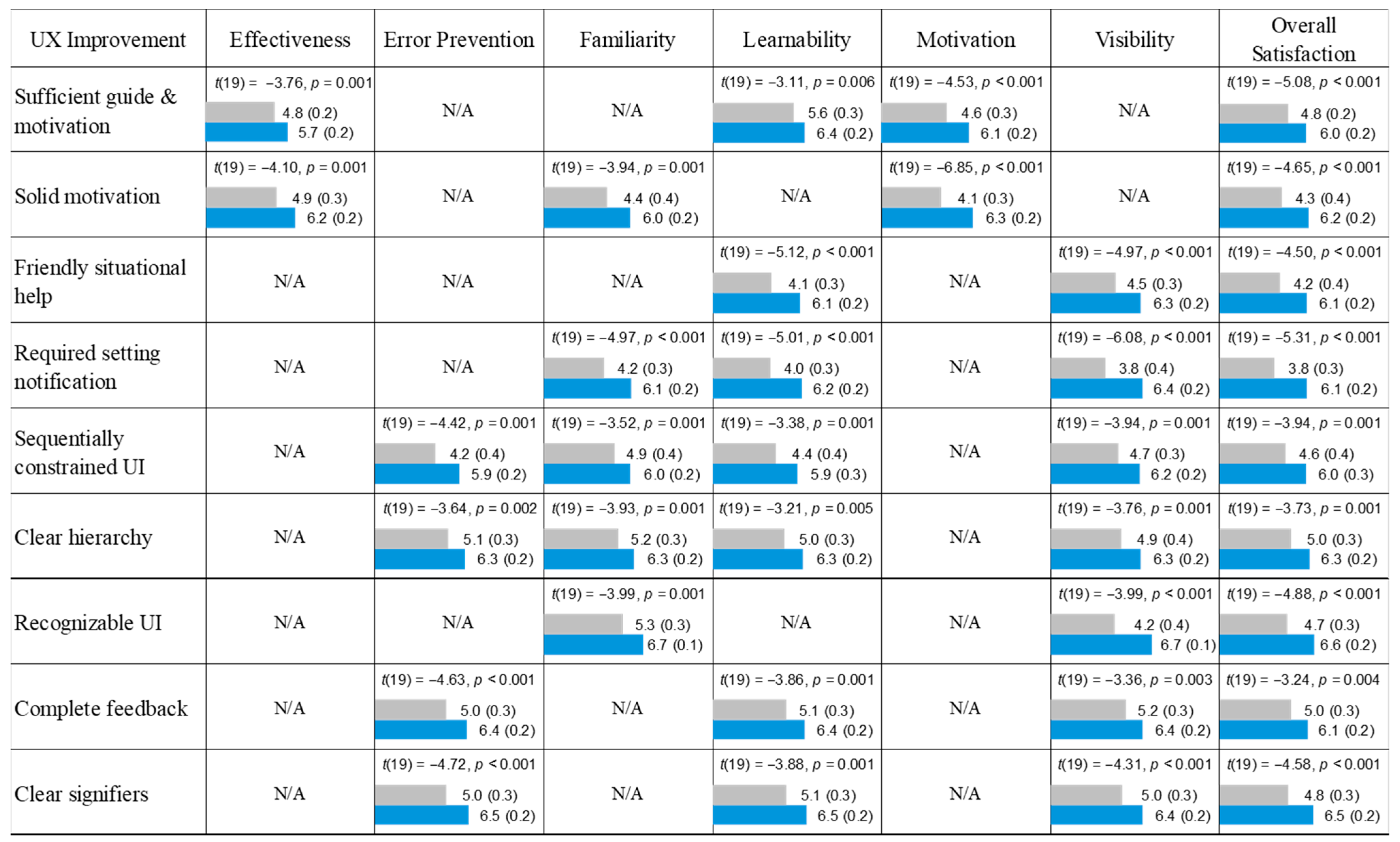 - Structural Constraints and Error Prevention: Implementing structural constraints through a Sequentially Constrained UI (Improvement 5) and Clear Hierarchy (Improvement 6) effectively mitigated setup-related errors. Error-prevention scores rose by 1.7 and 1.2 points, respectively, demonstrating that enforcing task order and restricting invalid inputs directly correlates with increased overall satisfaction (1.4 and 1.3 points; p < 0.01).