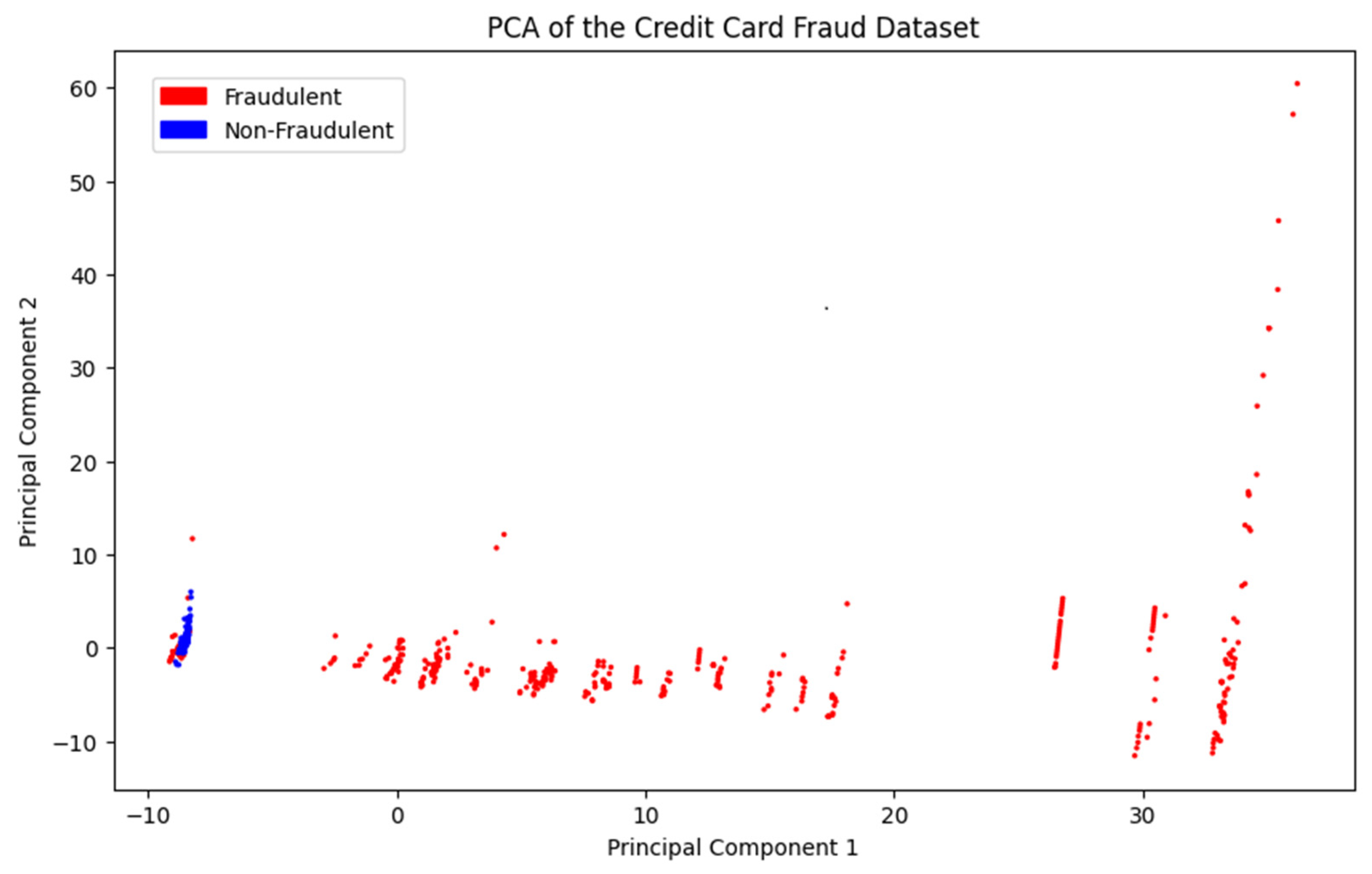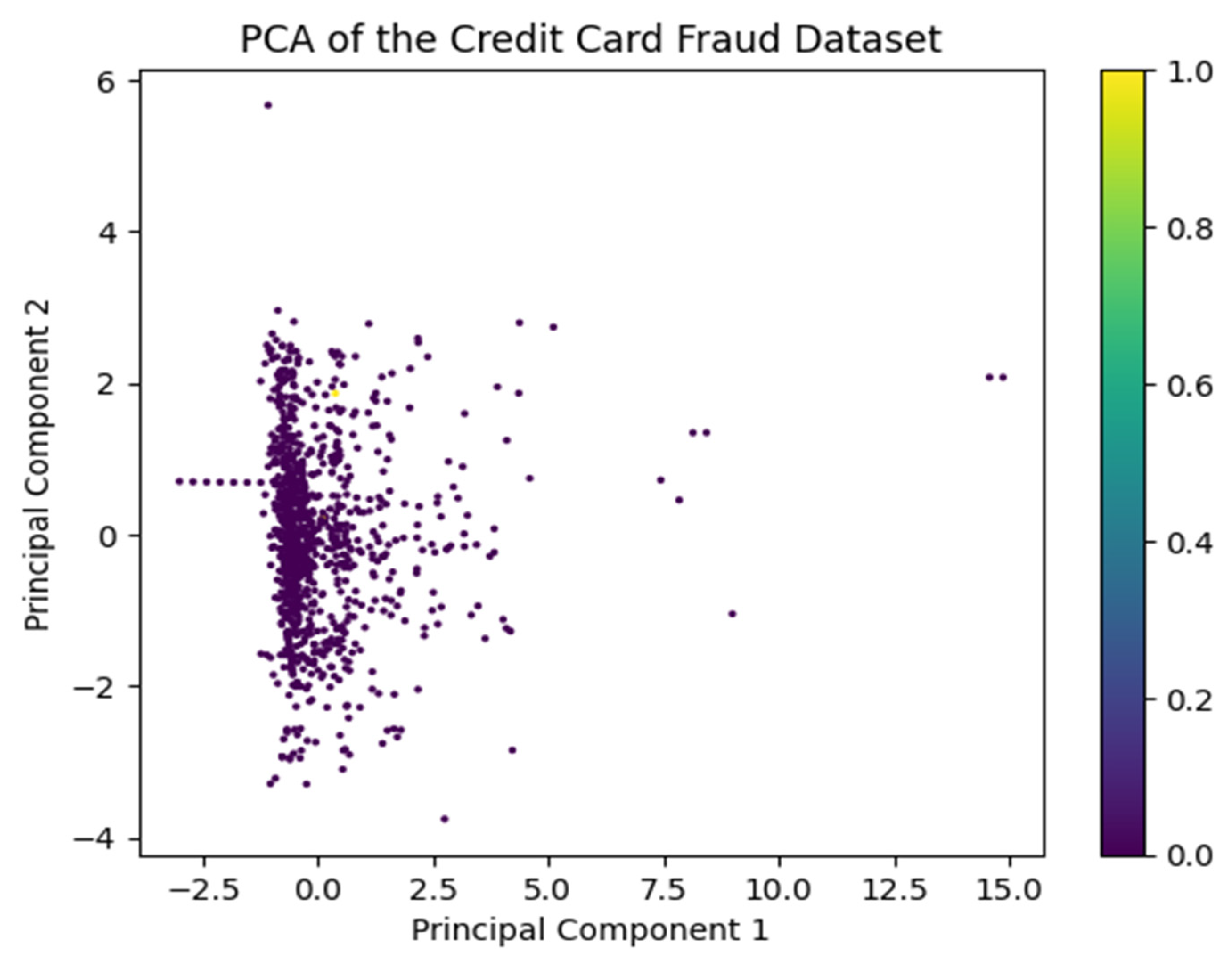 3]. Specifically, we used Principal Component Analysis (PCA) to reduce our dataset’s features to two dimensions and identify patterns and the variance analysis while optimizing real-time data processing in smart environments. By providing help to visualize data trends and relationships across transactions, this dimensionality reduction technique is essential for anomaly detection in smart environments, where identifying unusual patterns in sensor data, device activity, or network behavior can improve security and prevent potential system failures.