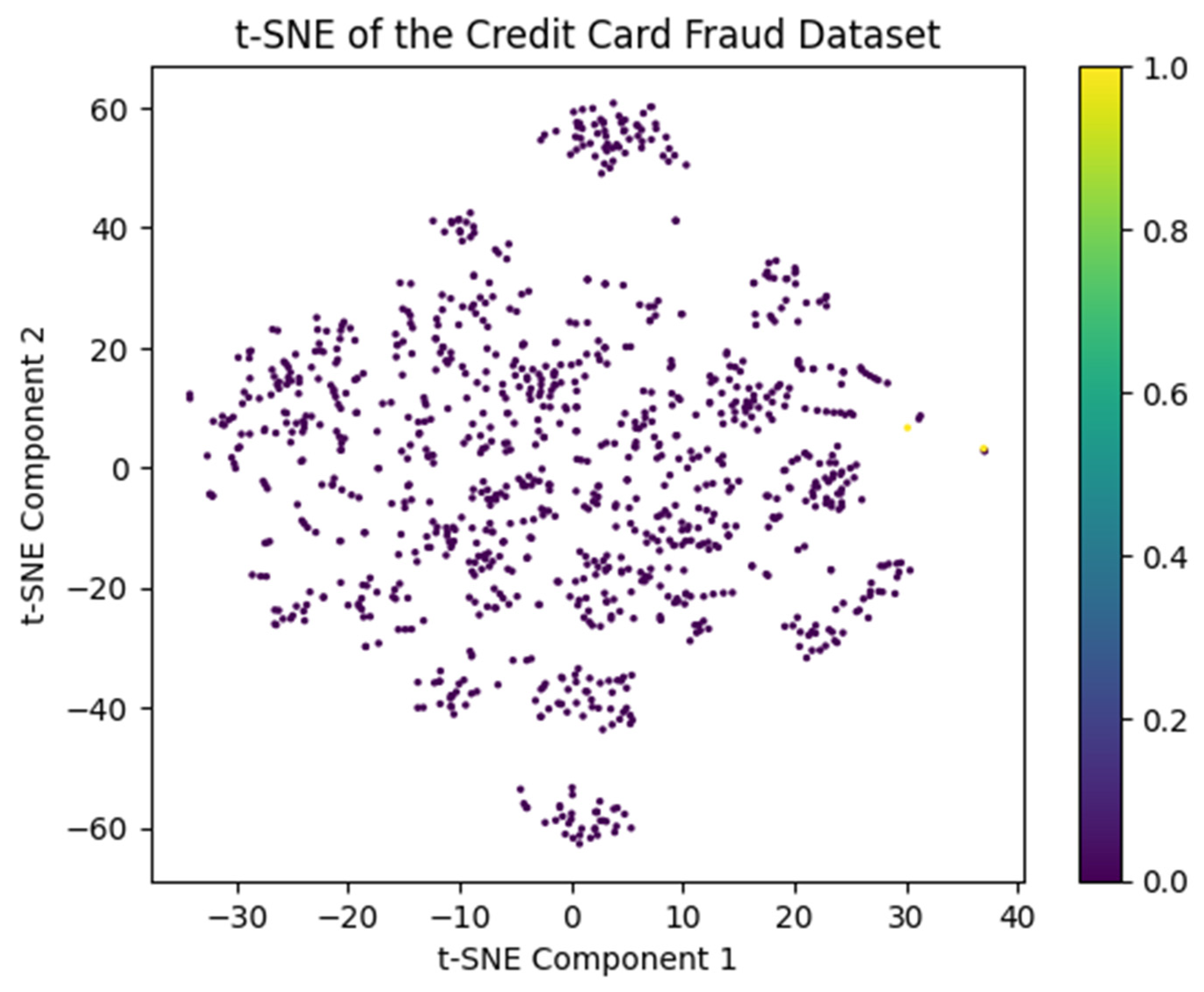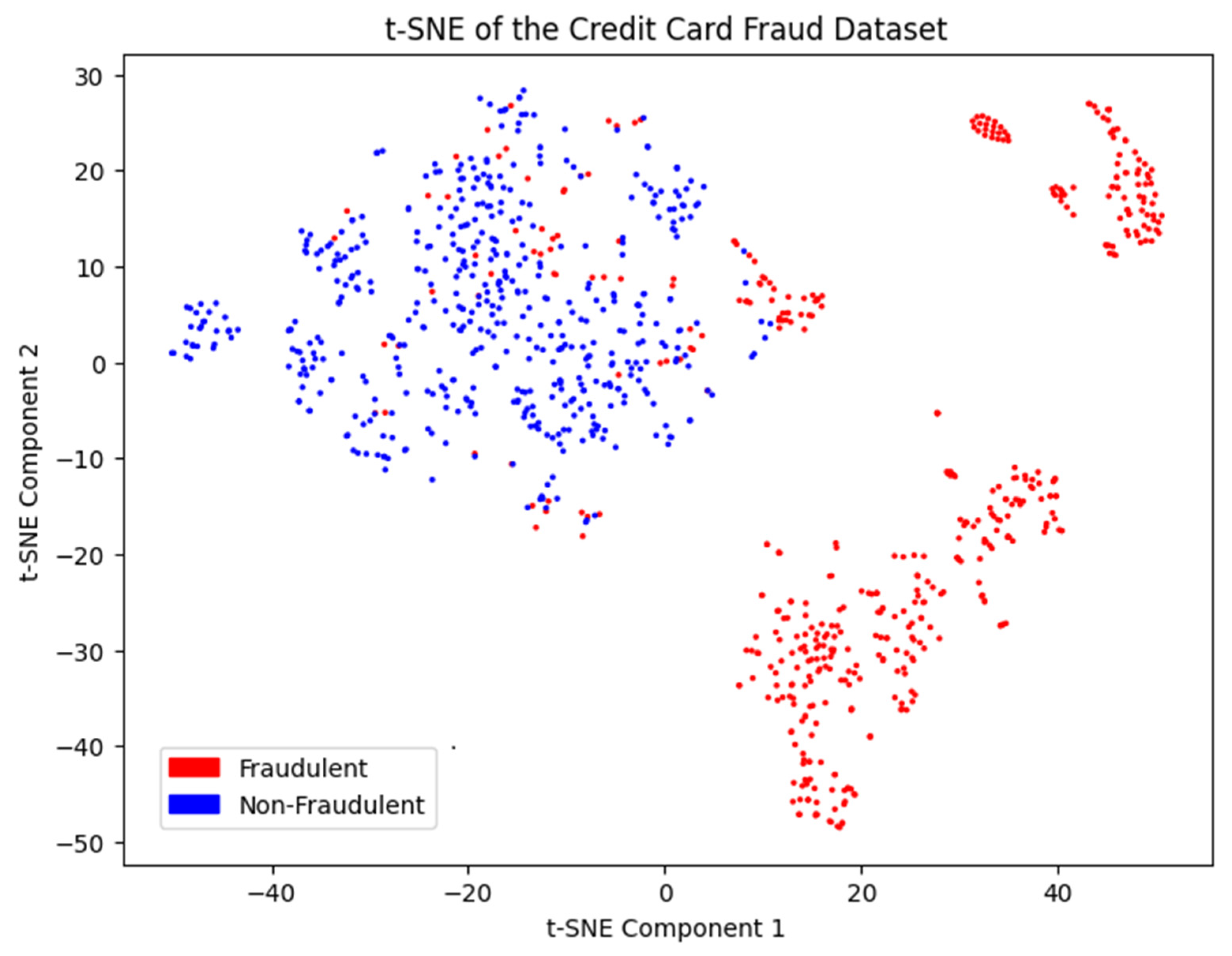 Figure 2). Finding groups of related transactions is made simpler by t-SNE’s remarkable characteristic of capturing non-linear structures. It is easier to identify suspicious patterns in the dataset, like unusual frequency or transaction amounts that significantly from a typical spending pattern, because it highlights tighter clusters of fraudulent transactions than PCA (