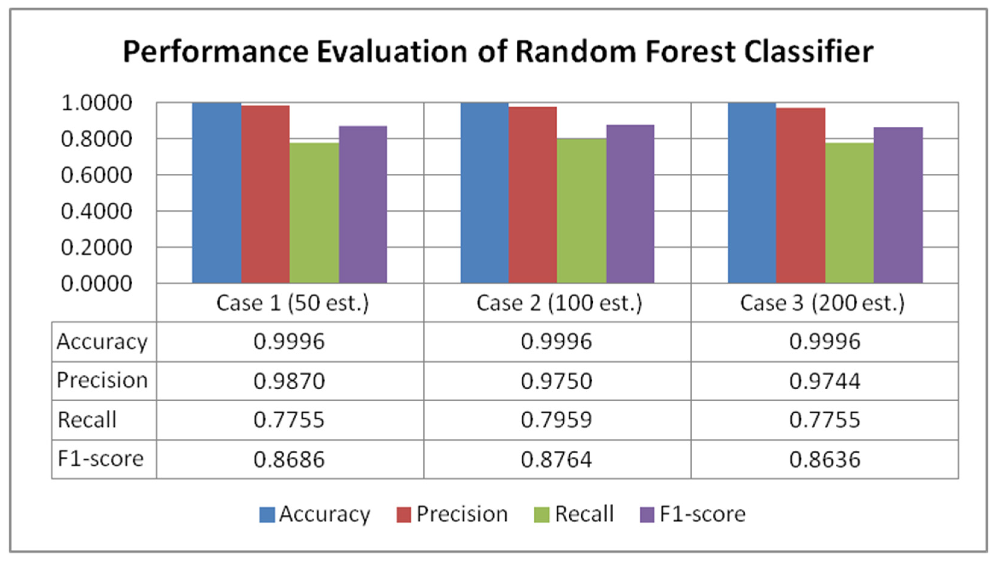 Figure 5, the accuracy of our proposed model is 0.9996 in all cases using 50, 100, and 200 estimators, respectively. The precision is in the range 0.9744 to 0.9870. The recall is in the range 0.7755 to 0.7959. The F-score is in the range 0.8636 to 0.8764.