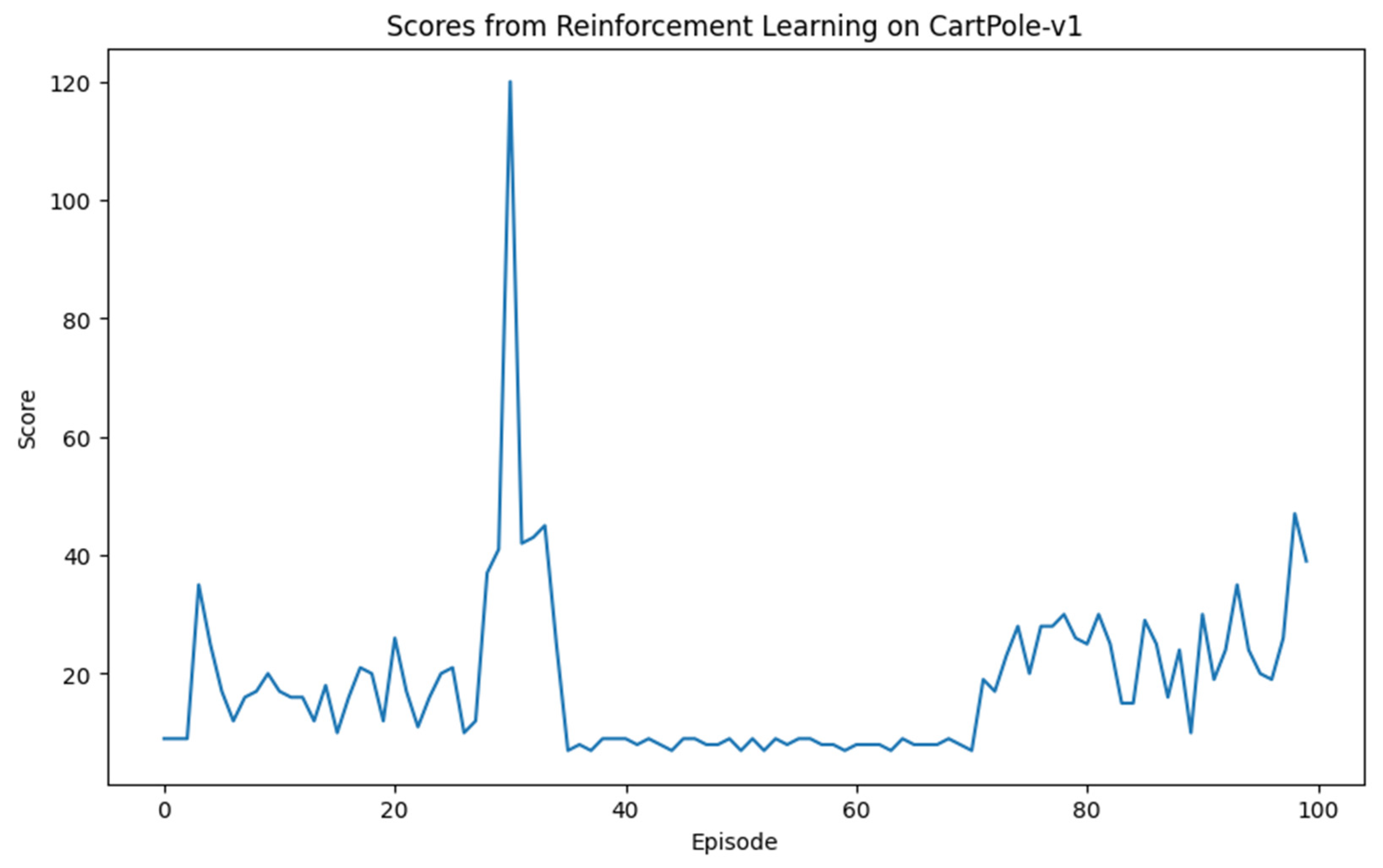 Figure 6 illustrates the performance of the RL agent trained on the CartPole (AI environment) part of the Open AI Gym toolkit over 100 episodes. First, the performance is inconsistent, indicating a lack of stability in developing a reliable strategy. A significant increase around episode 30 shows a brief successful strategy, then the further fluctuations around lower scores reveals the continuous process of exploration and exploitation of the RL agent. We should note that the CartPole environment is chosen as a standard benchmark for evaluating the stability and learning dynamics of the RL agent and does not simulate the fraud detection process.