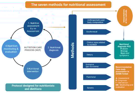 The seven methods in the nutritional assessment process and the recommended format for presenting case studies in Nutrition and Dietetics are summarized in the diagram. It depicts the continuum of the Nutrition Care Process (NCP), which consists of four stages: (1) nutrition assessment and reassessment, (2) nutritional diagnosis, (3) nutritional intervention, and (4) nutrition monitoring and evaluation. On the right, seven complementary nutritional assessment methods are outlined: anthropometry and body composition, biochemical assessment, clinical signs related to nutrition, dietary assessment, ecological factors (including gut microbiota), functional assessment, and genetic evaluation. Together, these methods provide comprehensive data for identifying nutritional problems and determining their etiologies using the PES format (Problem, Etiology, Signs and Symptoms). This information supports structured case analysis and documentation through the ADIME format (Assessment, Diagnosis, Intervention, Monitoring, and Evaluation).