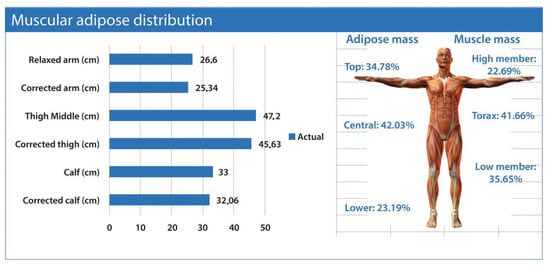 Muscular–adipose distribution. The figure illustrates segmental estimates of muscle and adipose mass derived from anthropometric assessment. The bar graph presents the relaxed and corrected circumferences of the arm, mid-thigh, and calf, reflecting regional muscle–fat composition. On the right, the schematic human figure depicts the relative contribution of adipose and muscular tissue across body segments. Data were obtained using the ISAK Metry software [12].