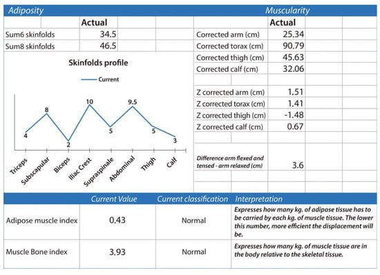 Adiposity and muscularity. The figure summarizes anthropometric indicators of adiposity and muscularity derived from skinfolds and corrected limb circumferences, including regional fat distribution, muscular Z-scores, and the adipose–muscle and muscle–bone indices, both classified as normal. Data were obtained using the ISAK Metry software [12].