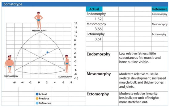 The figure displays the individual’s somatotype based on endomorphic, mesomorphic, and ectomorphic components, placing the subject in the meso-ectomorphic region, indicative of moderate muscularity, low adiposity, and linear body proportions. Data were generated using the ISAK Metry software [12].