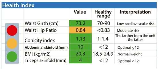 Health index derived from anthropometric and adiposity indicators. The figure synthesizes key metrics commonly used to assess cardiometabolic and nutritional status. These parameters include waist circumference, waist–hip ratio, conicity index, abdominal and triceps skinfolds, and body mass index (BMI), each contrasted with established reference values for healthy populations. A color-coded scale (green = optimal, yellow = moderate risk, red = high risk) enhances interpretation by categorizing the degree of associated risk. The evaluated subject presents a normal BMI (20.3 kg/m2), optimal skinfold levels (<12 mm), and low cardiovascular risk according to waist circumference, while the waist–hip ratio of 0.84 indicates moderate risk of central adiposity. As a whole, this composite profile provides an integrated overview of body composition and cardiovascular risk. Obtained from ISAK Metry software [12].