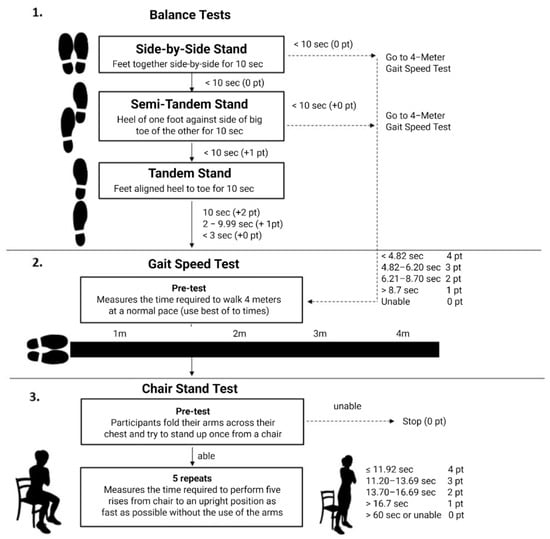 - Western, M.; Malkowski, O. Associations of the Short Physical Performance Battery (SPPB) with Adverse Health Outcomes in Older Adults: A 14-Year Follow-Up from the English Longitudinal Study of Ageing (ELSA). Int. J. Environ. Res. Public Health 2022, 19, 16319. [Google Scholar] [CrossRef]