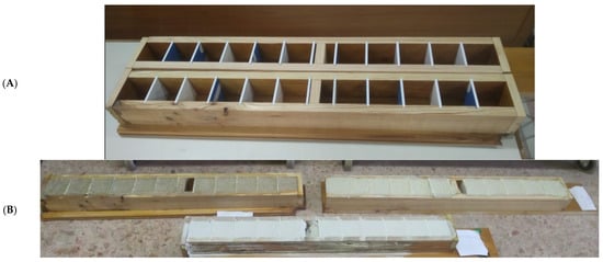 The molds that were formed to receive the mixtures were of 40 × 40 × 40 mm dimensions (Figure 2). The dimensions of the produced specimens are considered ideal for the subsequent measurement of moisture content, density, compression strength, elasticity, hardness, swelling and shrinkage according to the literature [27]. Additionally, Lakshmi et al. [28] and Cemalgil et al. [29], who have conducted experiments on the introduction of natural residues into mortars, state that the mold dimensions of 40 × 40 × 160 mm can be considered even more suitable for the measurements of bending strength in the first step and subsequently (after bending strength test) for compression strength and hygroscopic (absorption/swelling) properties measurement, among others.