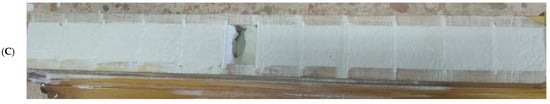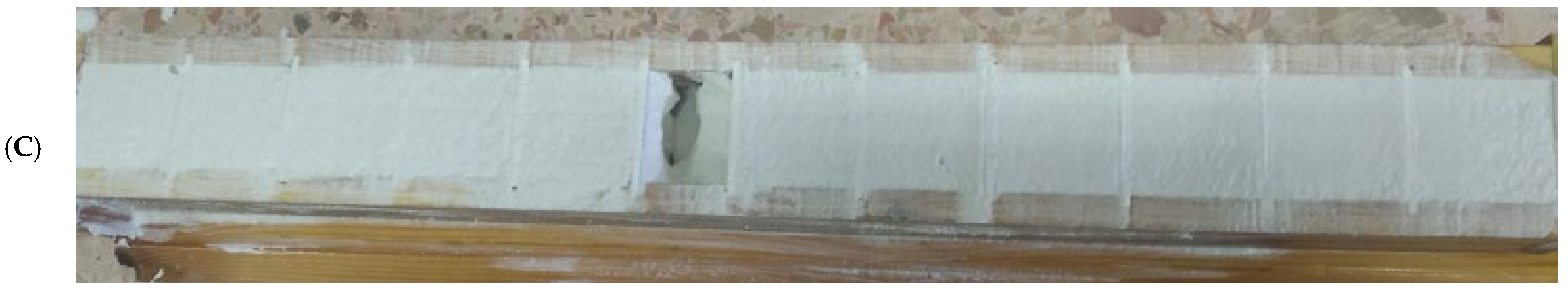 Mortar preparation followed, mixing and blending adequately the powder of mortar material (of the two different types of mortars: Mortar 1 and Mortar 2, M1 and M2, respectively) with the appropriate amount of water as proposed by each mortar’s manufacturer (ratio of 93.3 mL mortar powder: 26 mL water) to be adequately homogenized (laboratory mixing device was employed for 5 min/synthesis). These two mortar types employed in the experimental work were both purchased from the market in packages of 5 kg. The mortar material 1—M1 is a rapid-setting repair mortar of general purpose with the following technical characteristics: Reaction to fire: Class A1, adhesion: 0.4 N/mm2—FP: B, water absorption: W0, water vapor permeability: μ 9, thermal conductivity: (λ10 dry), and durability: (in freezing–thawing). Evaluation of the mortar is based on the provisions in force in the intended application/place where the mortar was applied.